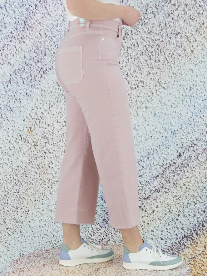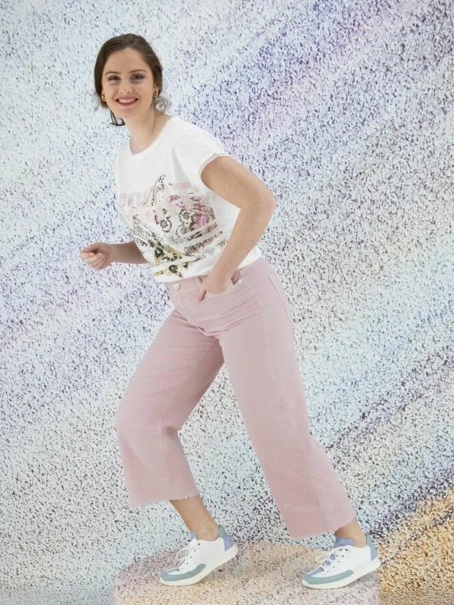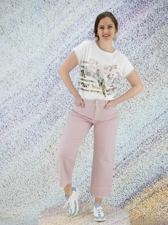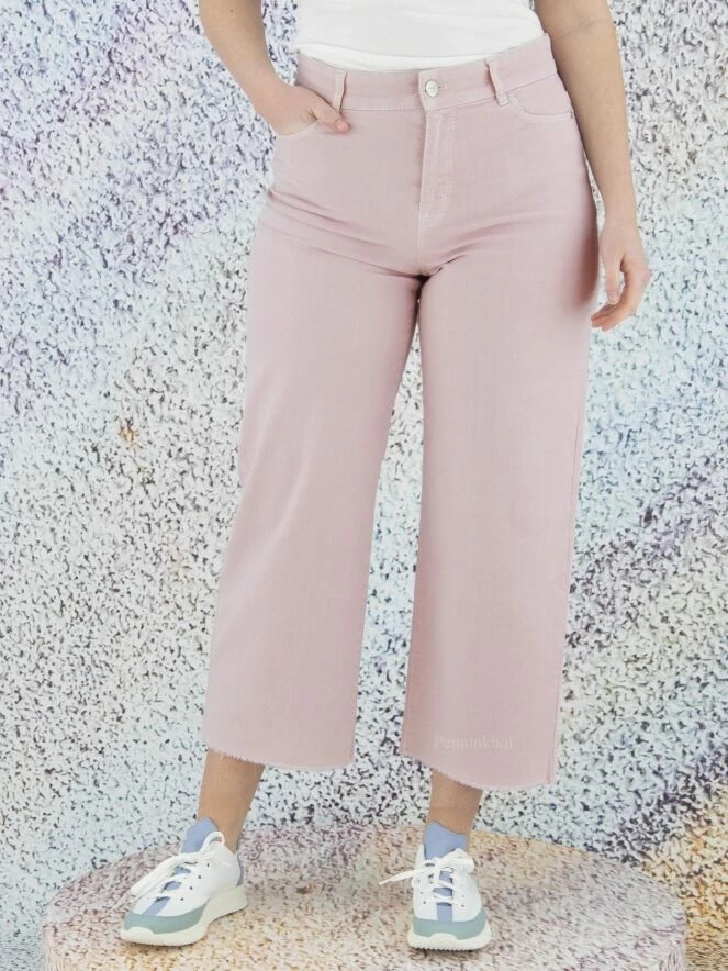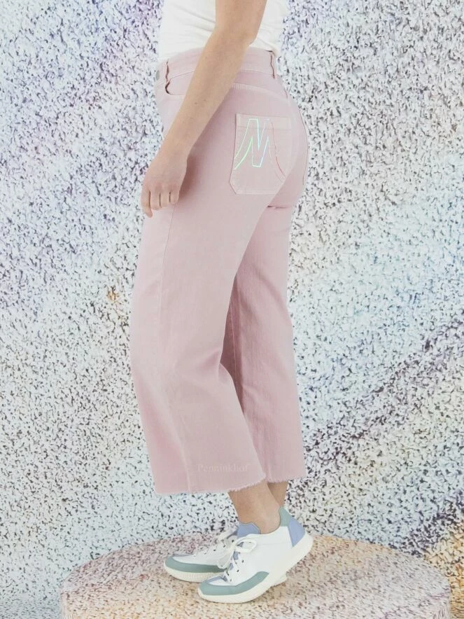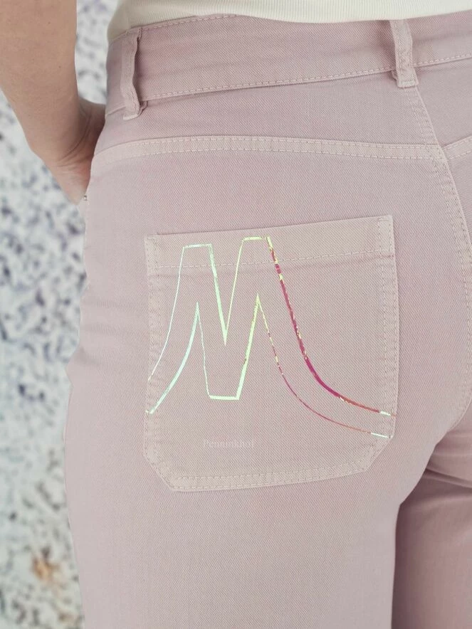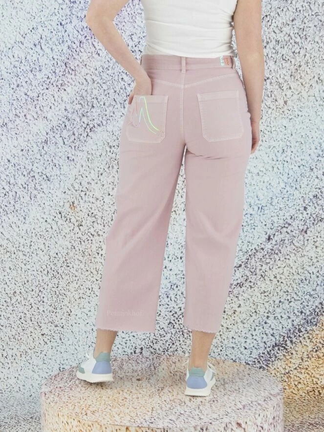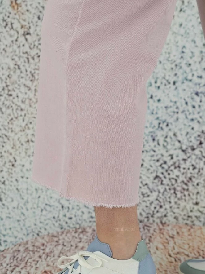 Jean large de la marque Marc Cain, de couleur rose pastel. Le jean est à coupe droite avec un ourlet finement frangé au bas des jambes. Au dos, une grande lettre « M » est imprimée en surbrillance sur la poche gauche. Lavage à 30 degrés.