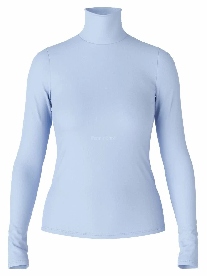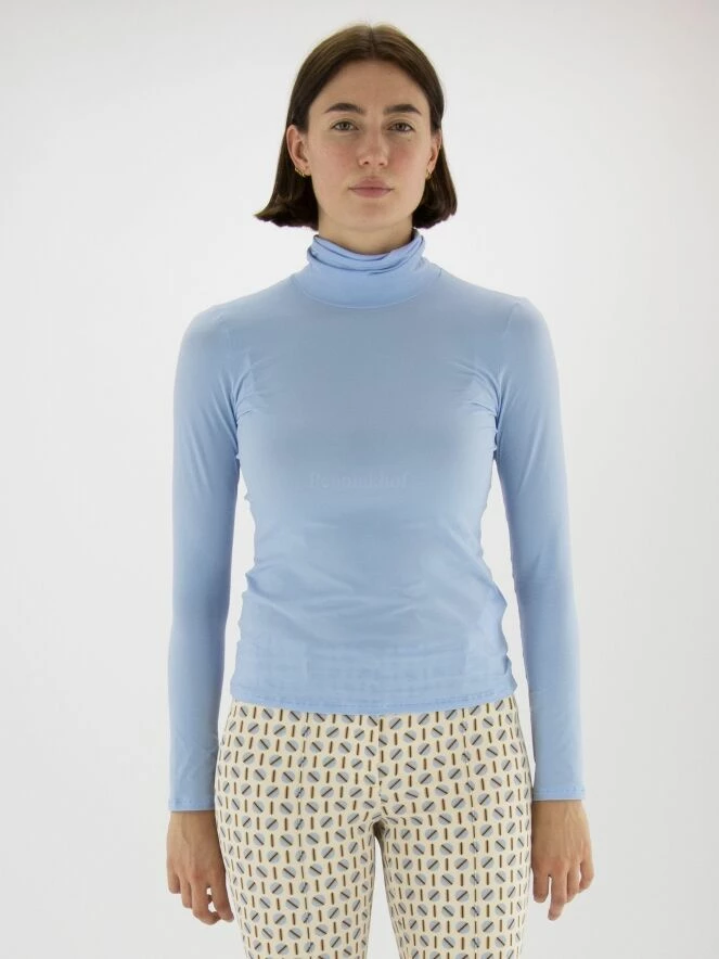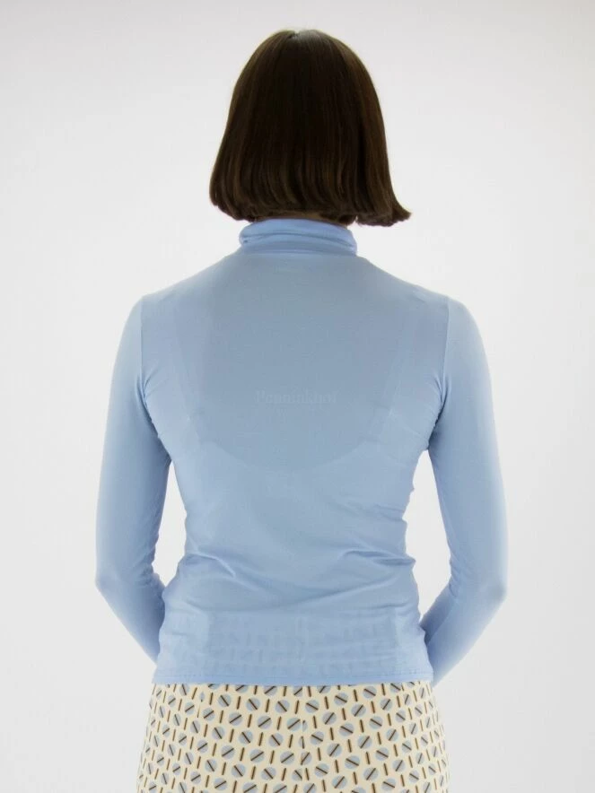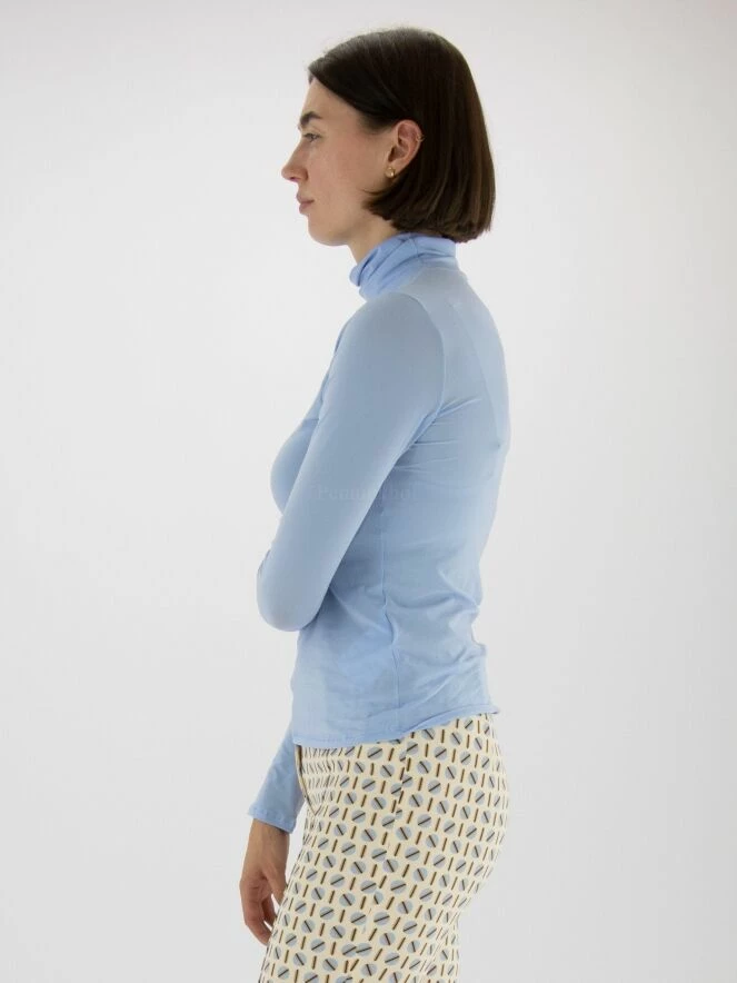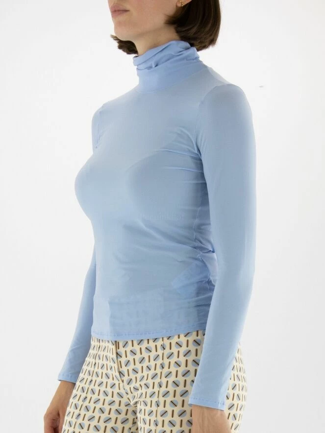 Tee-shirt légèrement transparent de la marque Marc Cain, de couleur bleu glacier. Le tee-shirt présente un col roulé et des manches longues. Lavage à 30 degrés.
