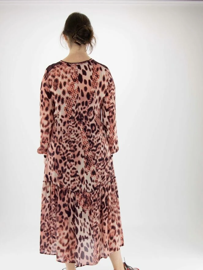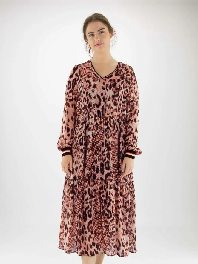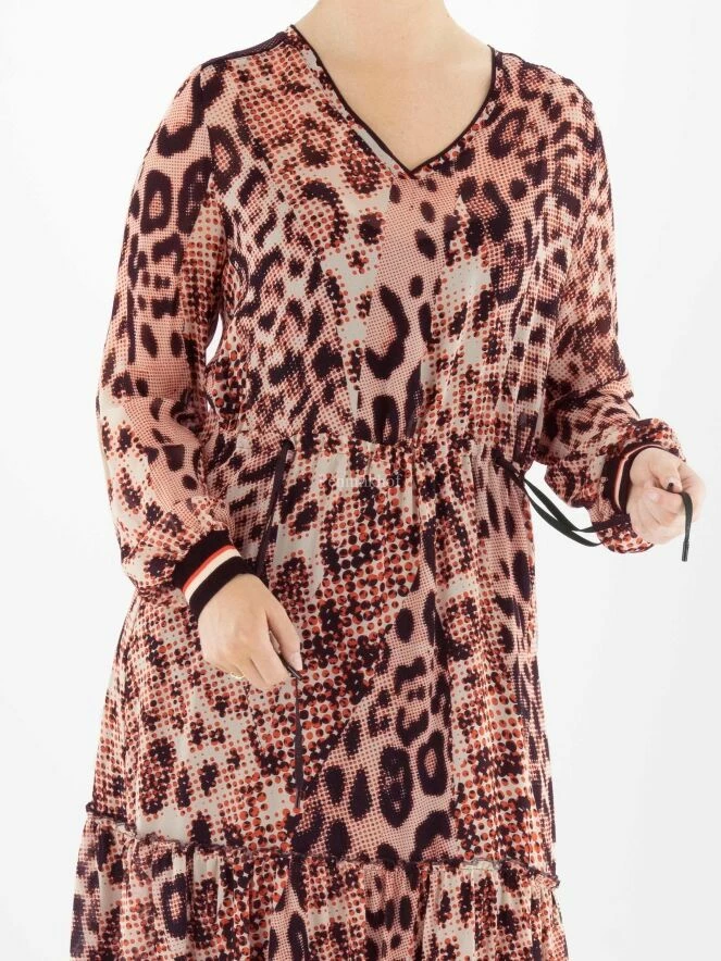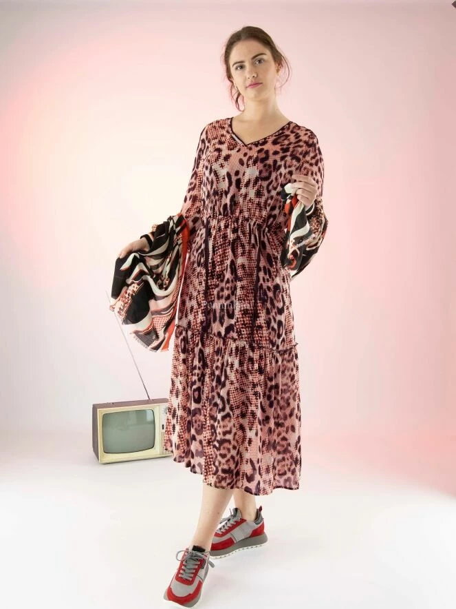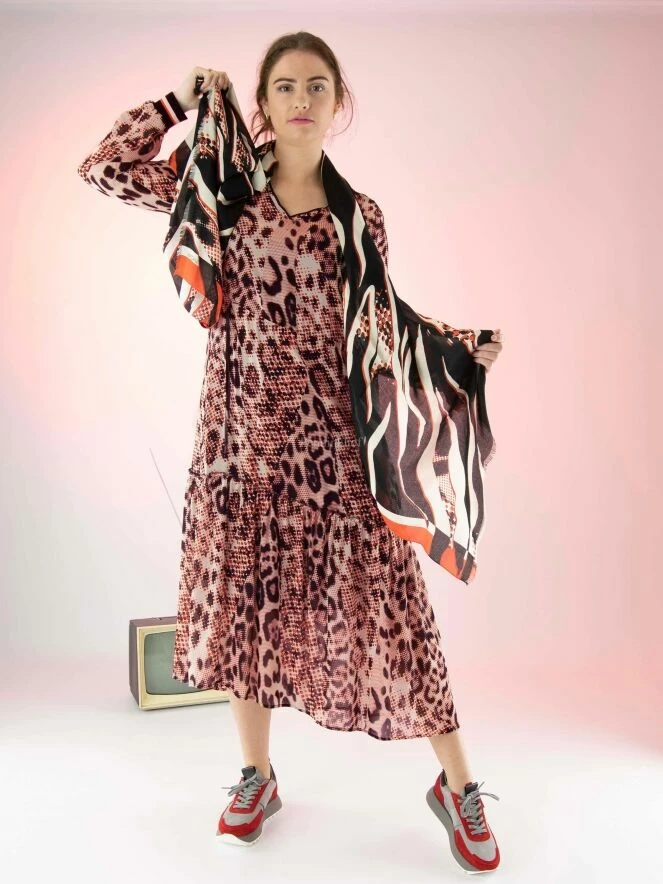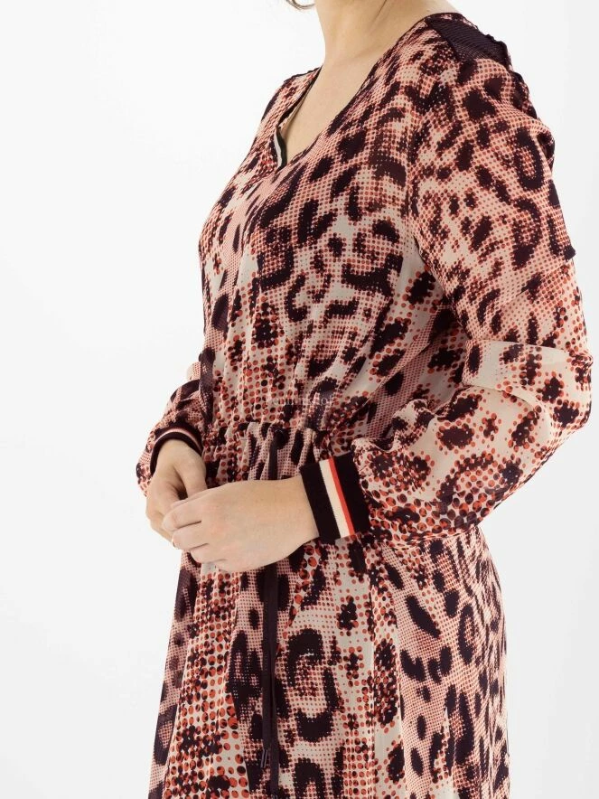 Robe Marc Cain en imprimé panthère graphique avec les couleurs rouge, blanc crème et noir. La taille est élastiquée et cousue, avec un cordon de serrage en tunnel. La robe est accompagnée d’une sous-robe de couleur noire unie. Juste au-dessus du genou se trouve une couture le long de laquelle le tissu est délicatement plissé. Cette robe peut être lavée à la main.