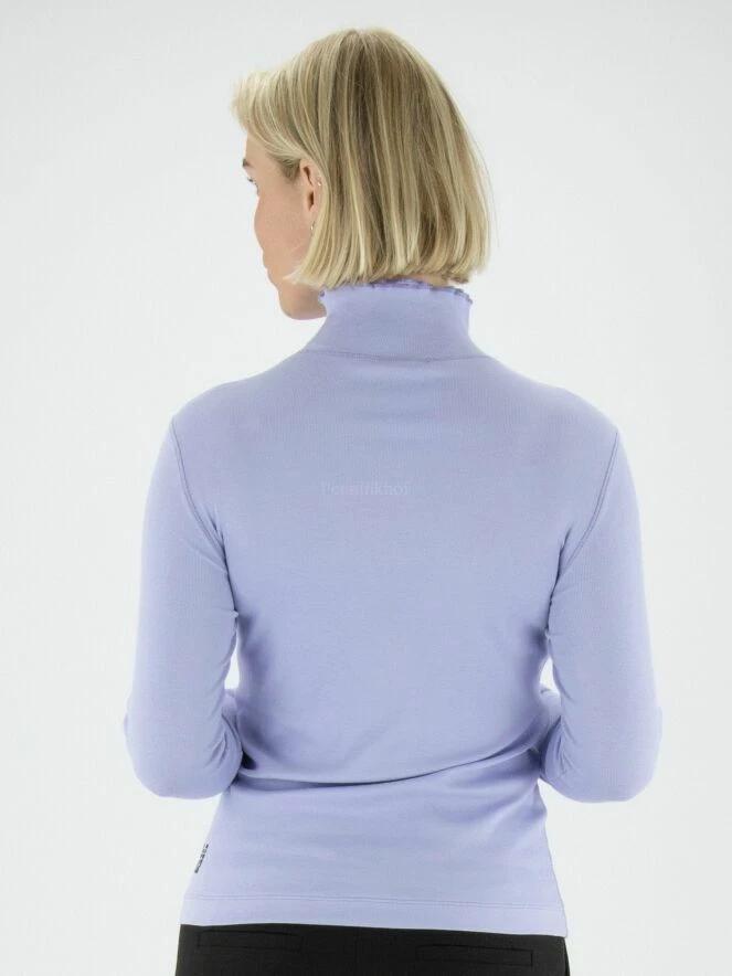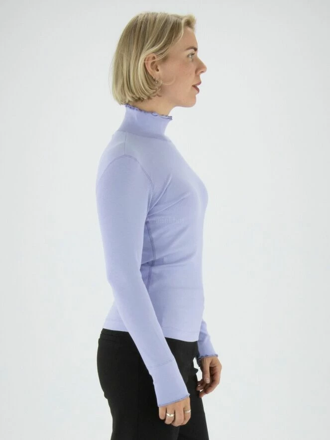 Une fine chemise côtelée de Marc Cain dans la couleur lilas. La – shirt a un col roulé avec un bord ondulé. Ce détail revient à l’extrémité des manches longues. Cette chemise peut être lavée à 30 degrés.