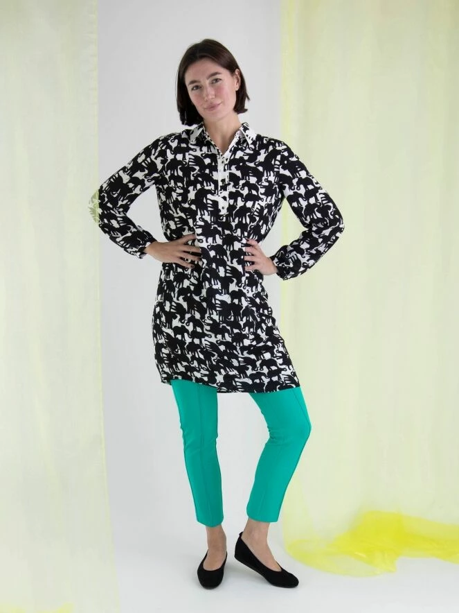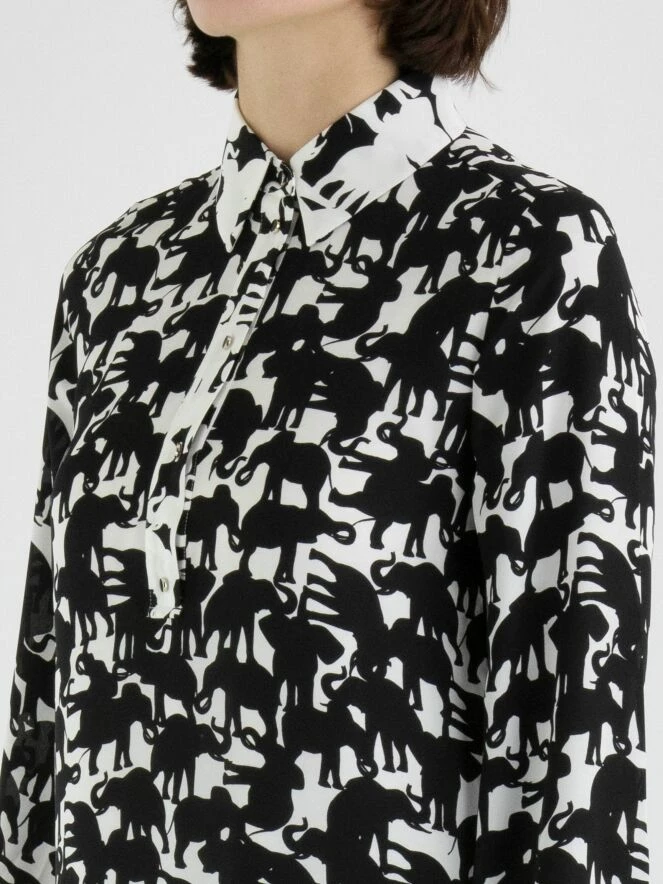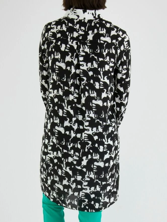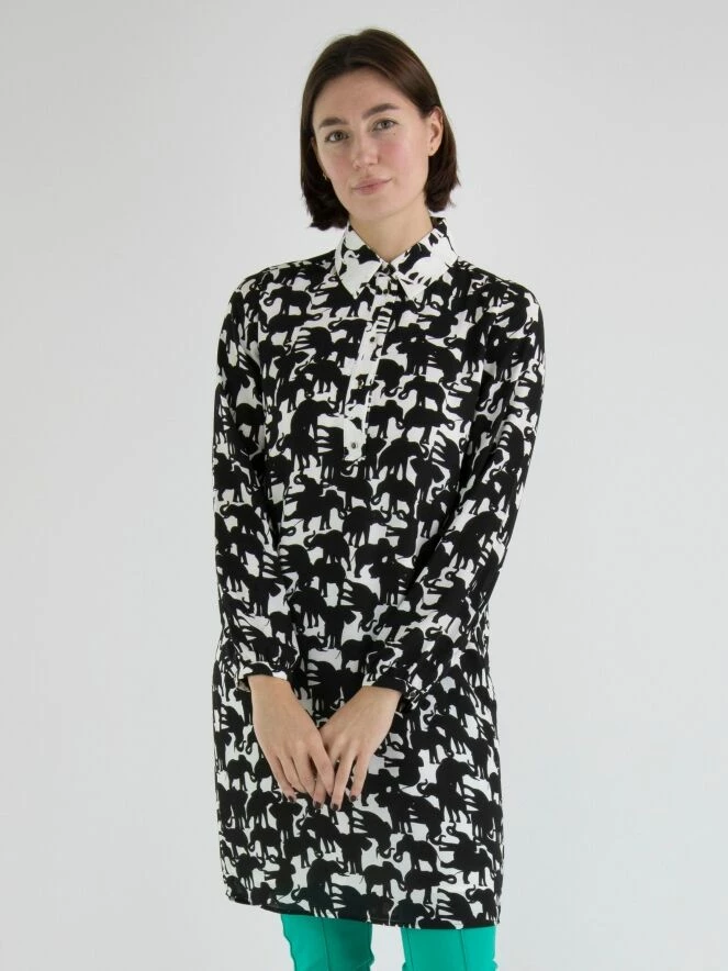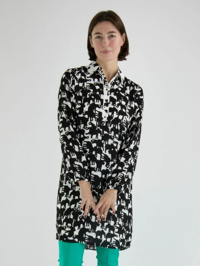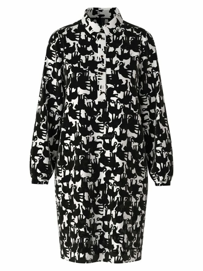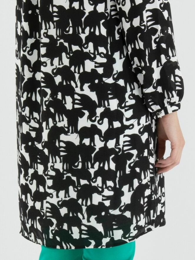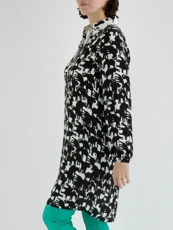 Une robe de Marc Cain avec un imprimé graphique d’éléphants en noir et blanc. Du col, il y a une fermeture à boutons jusqu’en dessous de la poitrine. L’imprimé sur le col est dans un style réversible. La robe est doublée et peut être lavée à 30 degrés.