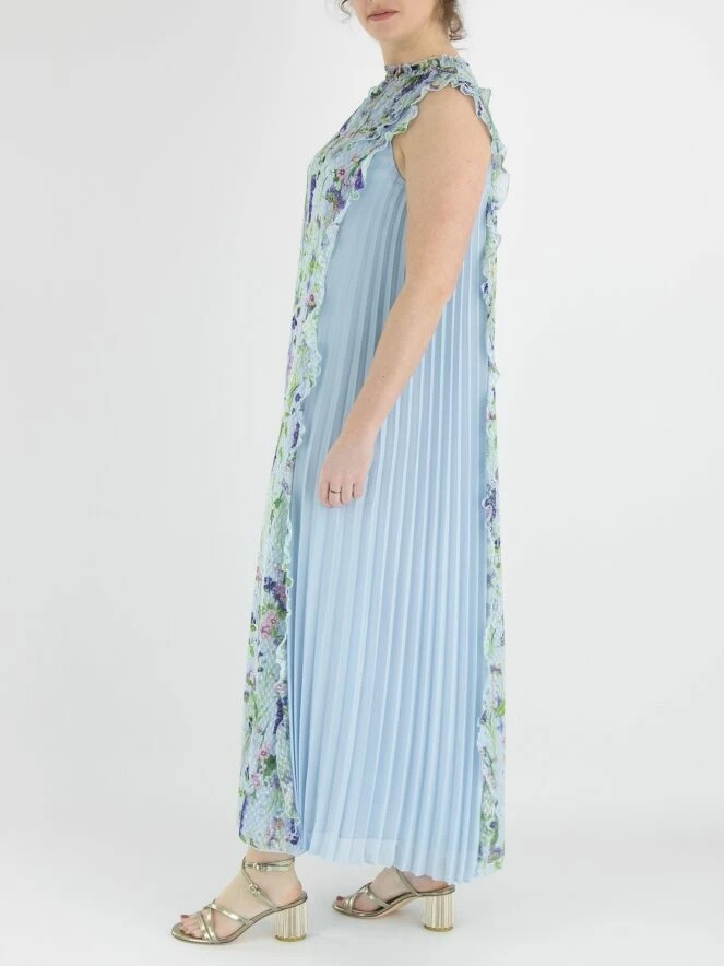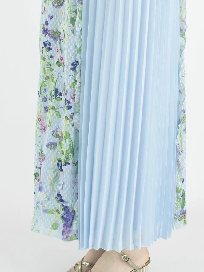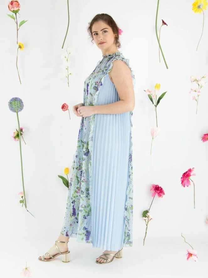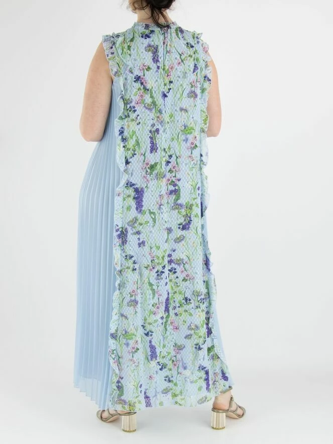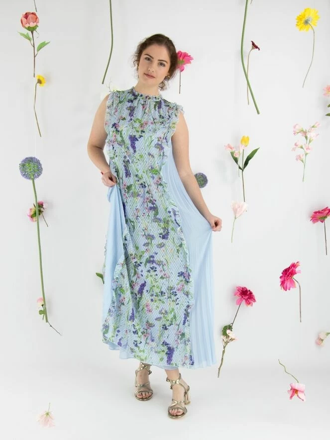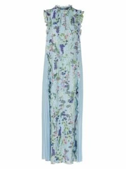 Une robe de Marc Cain avec un imprimé floral en violet, vert et rose sur un fond bleu lavande. Dans le tissu transparent, une structure en forme de goutte est incorporée. Sur les deux côtés, le tissu est plissé comme un plissé dans un tissu uni. Le col rond haut est finement plissé avec un fil élastique. Sur la couture, le tissu imprimé est finement plissé. La robe est doublée et peut être lavée à 30 degrés.