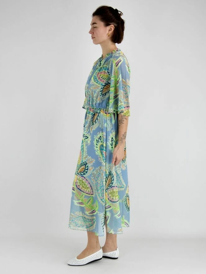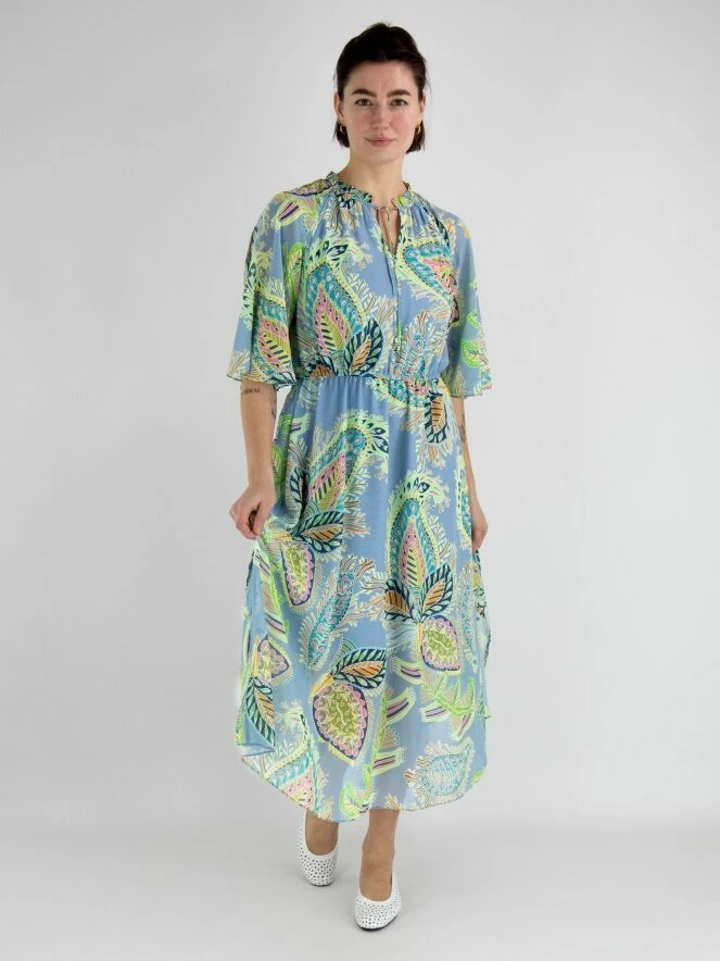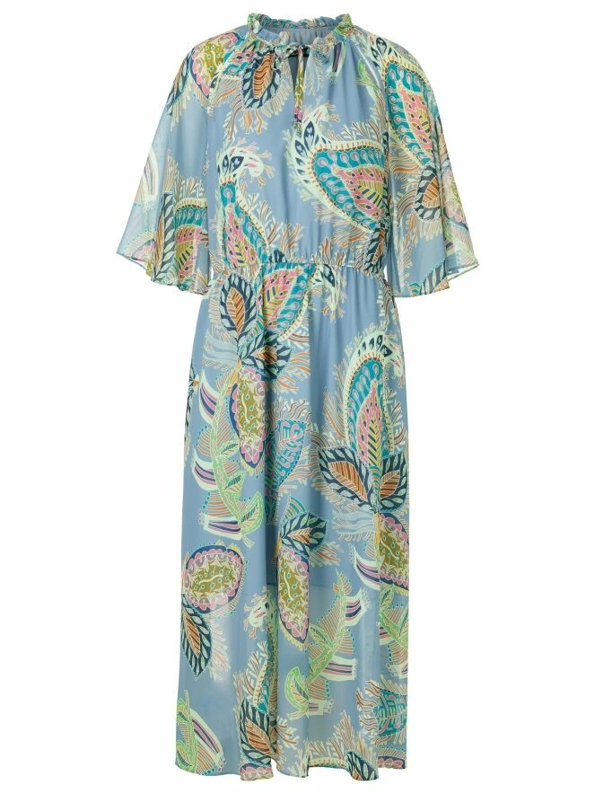 Une robe de Marc Cain avec un imprimé feuille multicolore sur un fond lilas. À partir de l’encolure ronde plissée, il y a deux cordons. Au centre de l’encolure ronde, il y a une découpe en V. Les manches courtes en éléphant sont transparentes. Il y a un cordon élastique dans une finition de tunnel à la taille. La robe a une silhouette évasée à partir de la taille. Elle est doublée et peut être lavée à 30 degrés.