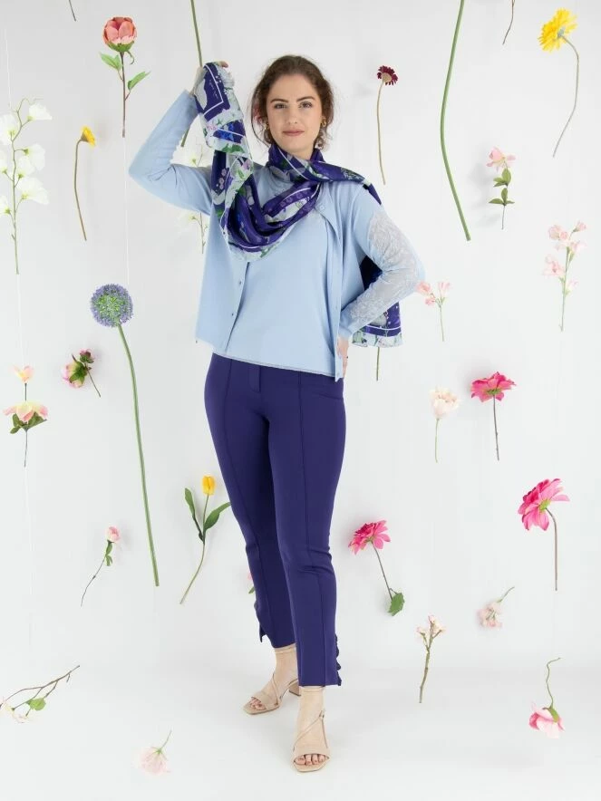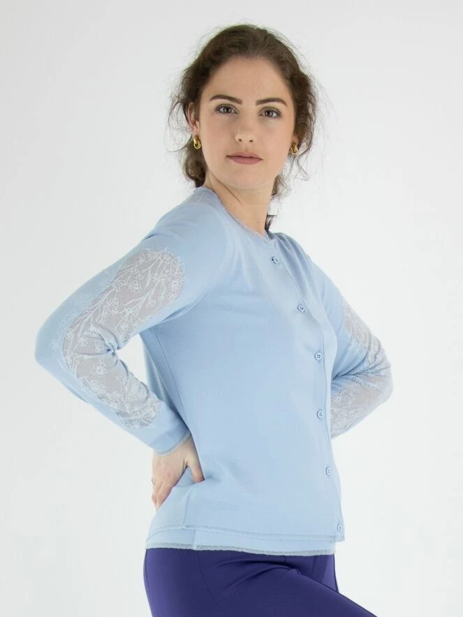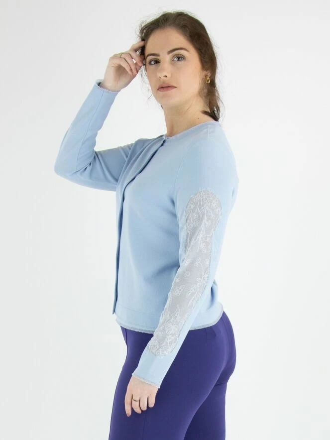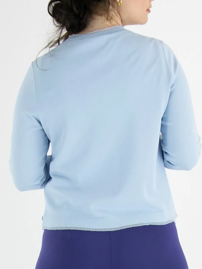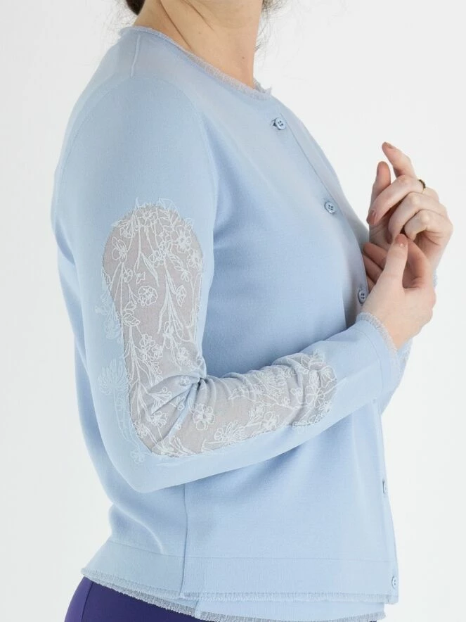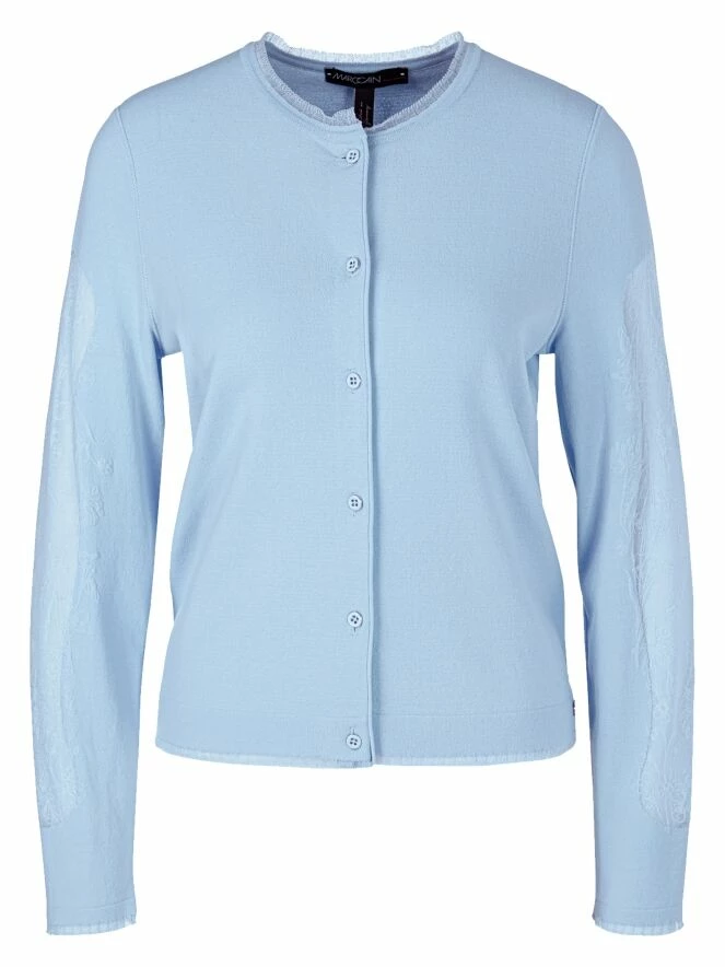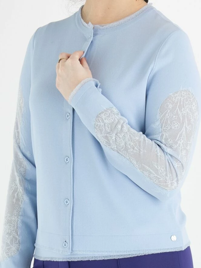 Un cardigan de Marc Cain de couleur bleu lavande. Tout le long des bords du cardigan, il y a une bordure transparente étroite partout. Le haut des manches est en tissu voile transparent avec un motif floral intégré. Ce cardigan peut être lavé à 30 degrés.
