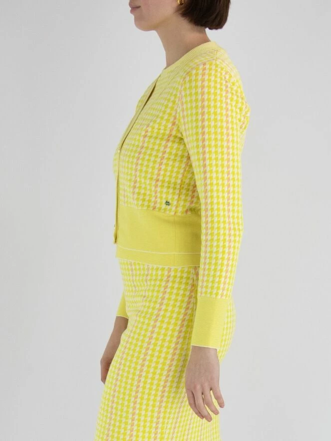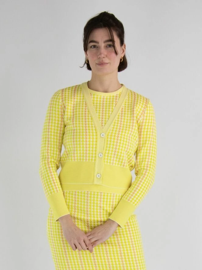 Un cardigan court de Marc Cain dans un imprimé graphique avec plusieurs nuances de jaune, blanc et orange. Le long du bord de l’encolure en V se trouve une garniture mouchetée qui se poursuit le long de la fermeture vers le bas. En bas et à l’extrémité des manches longues, il y a une bordure en tricot doux avec un motif de fines rayures. Ce cardigan peut être lavé à 30 degrés.