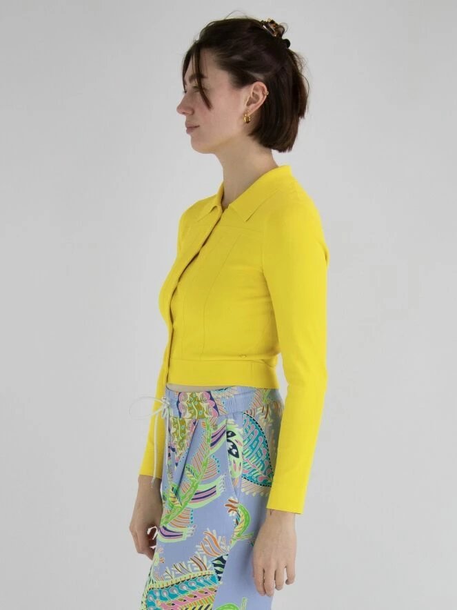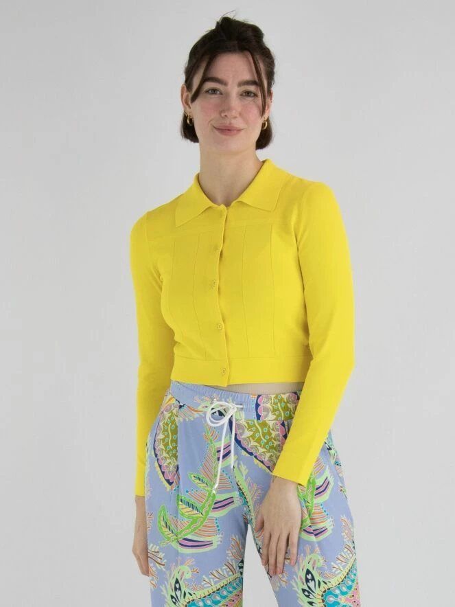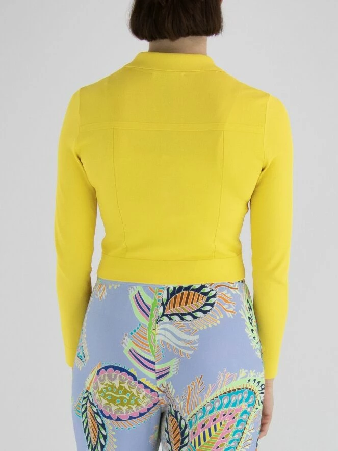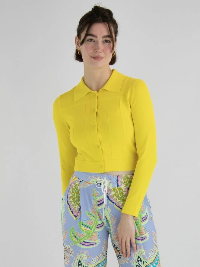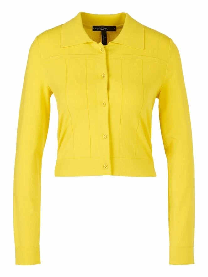 Cardigan court de Marc Cain de couleur jaune. Le cardigan se ferme par un bouton caché et peut être lavé à 30 degrés.