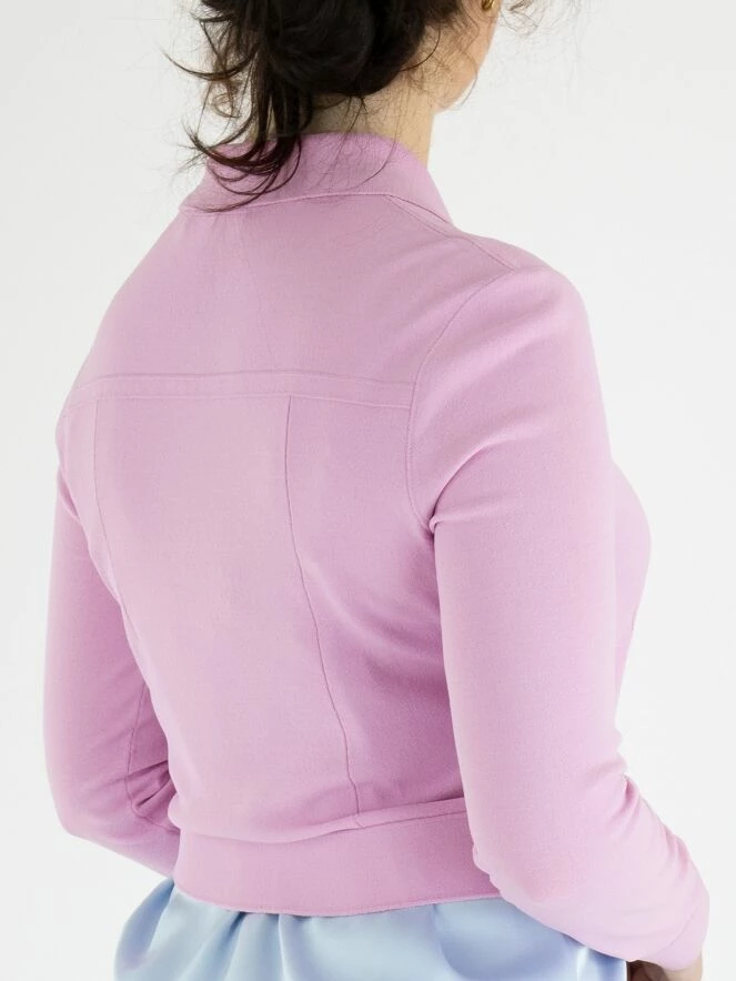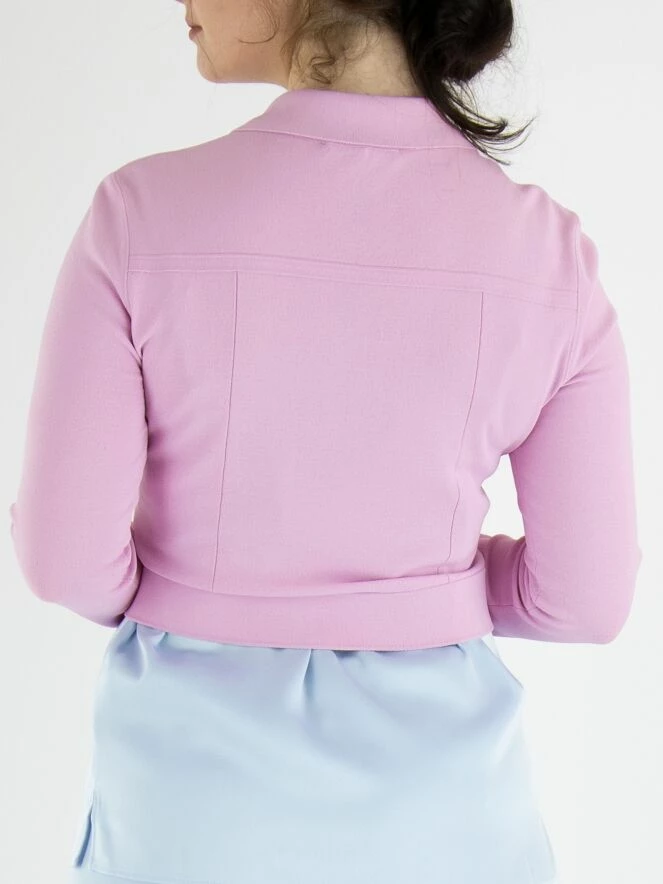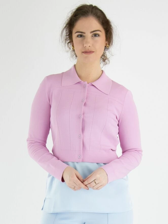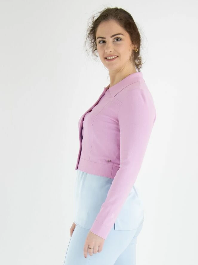 Cardigan court de Marc Cain de couleur rose. Le cardigan se ferme par un bouton caché et peut être lavé à 30 degrés.