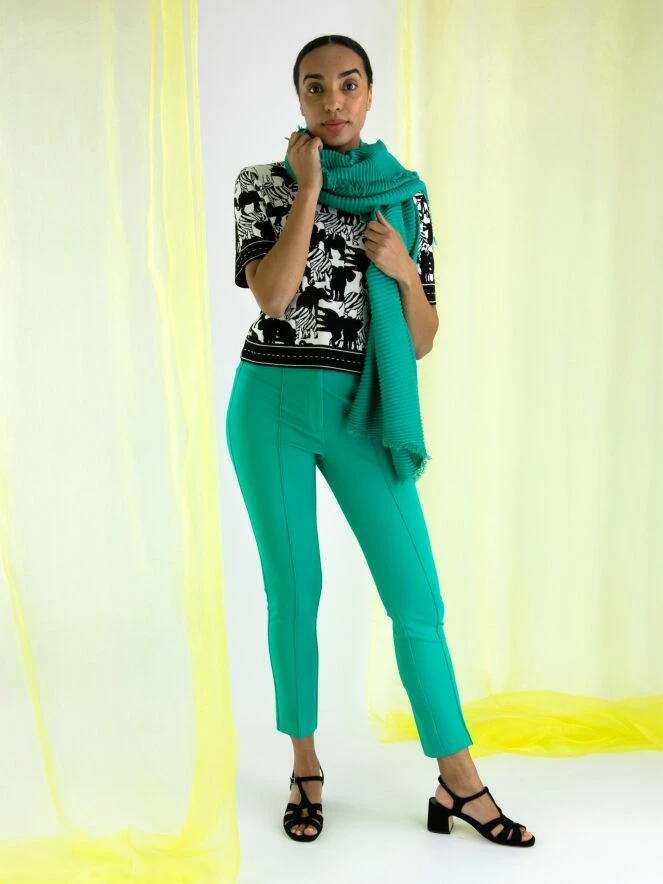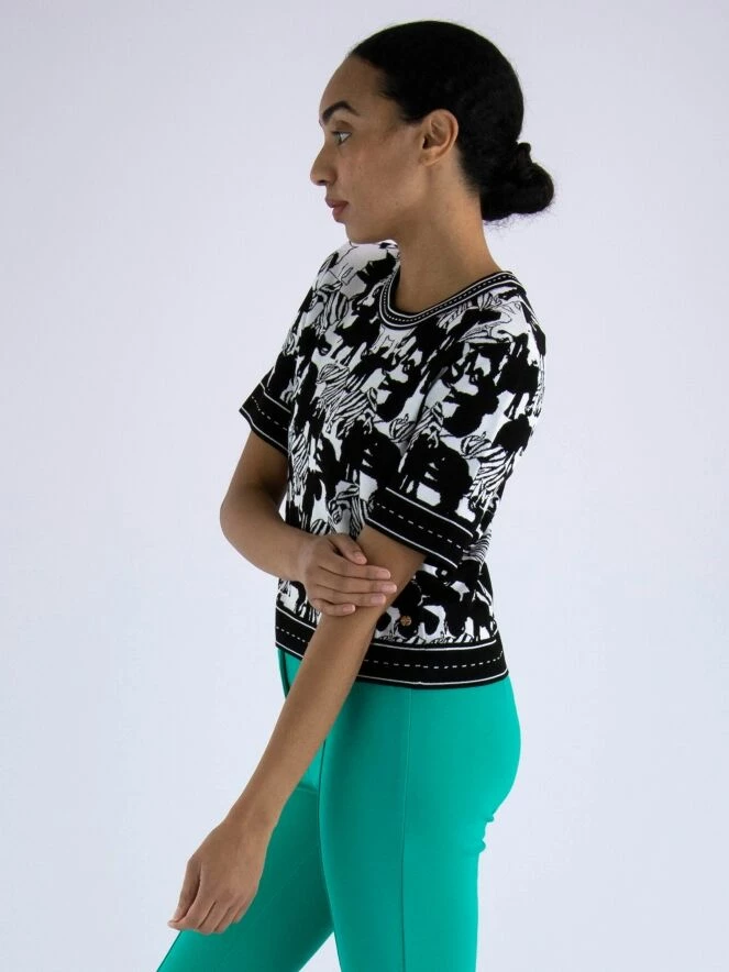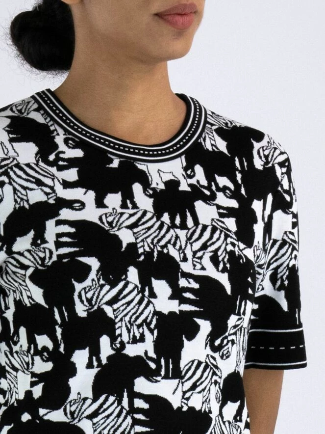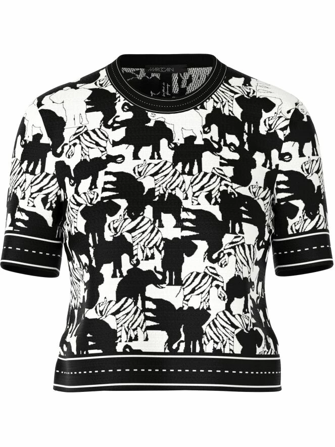 Un shirt court ou un pull-over de Marc Cain avec un imprimé graphique d’éléphants en noir et blanc. Le long du bord du col rond, des manches courtes et du bas, il y a une bordure imprimée dans un motif de rayures. Le shirt peut être lavé à 30 degrés.