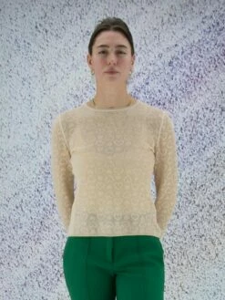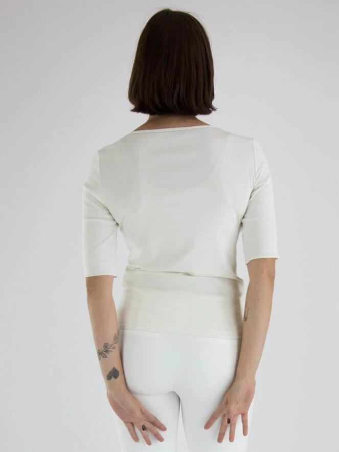 Un chemisier de Marc Cain en blanc crème. Le chemisier a un col rond et des manches courtes avec un revers. Le long de la couture sur les épaules se trouve une bordure en strass. Ce chemisier peut être lavé à 30 degrés.