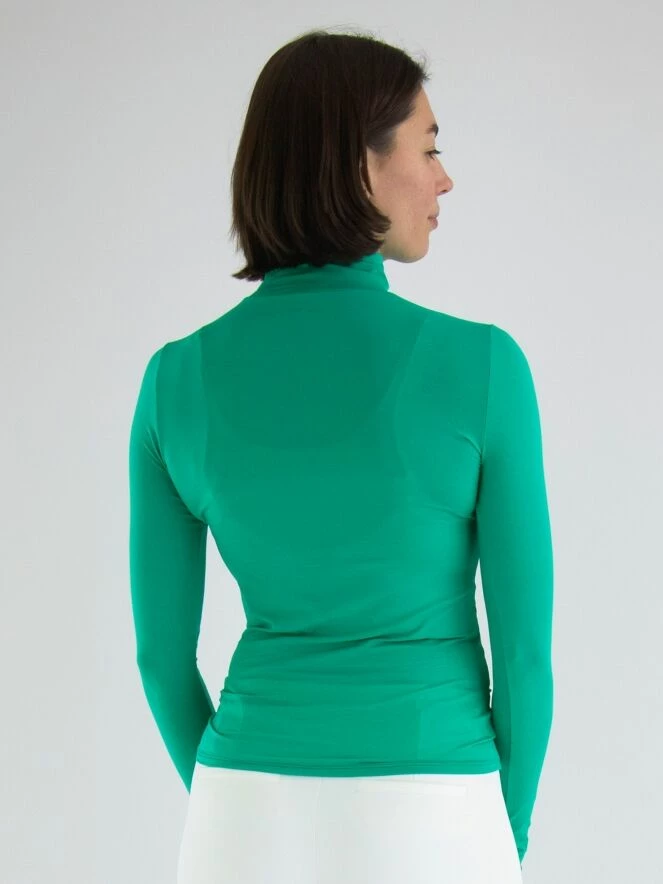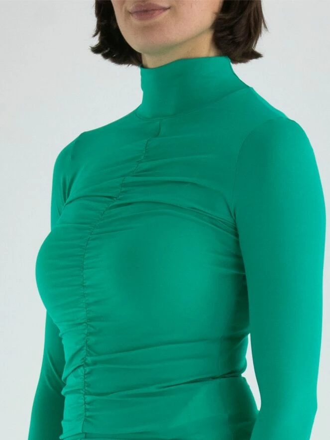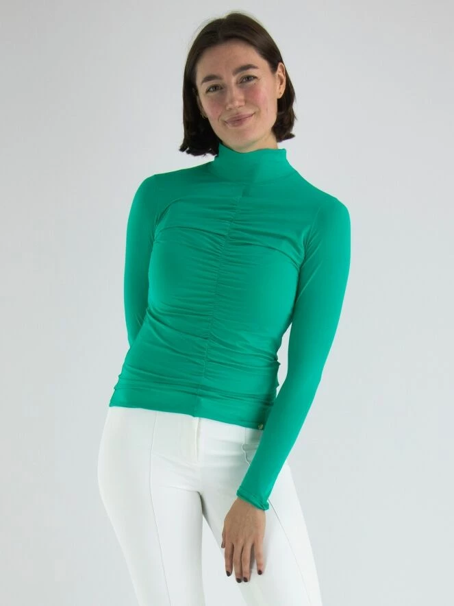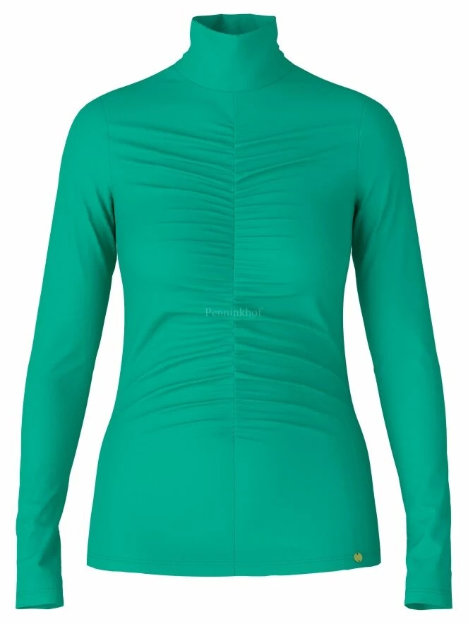 Un chemisier tunique de Marc Cain en turquoise. Au milieu du devant, il y a une couture le long de laquelle le tissu est finement plissé. Le chemisier a un col montant et peut être lavé à 30 degrés.