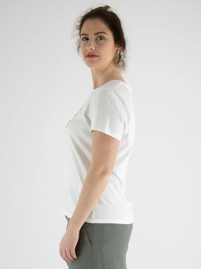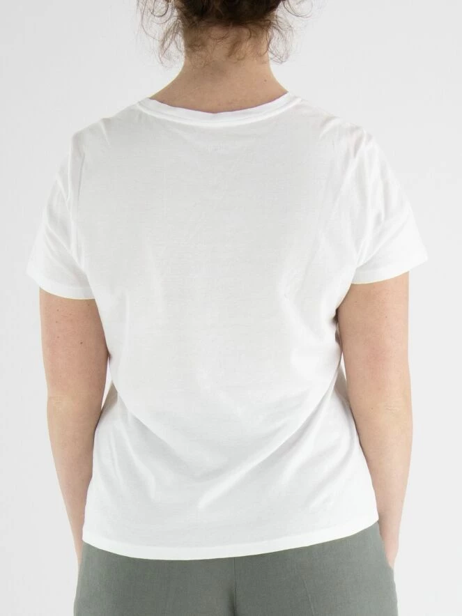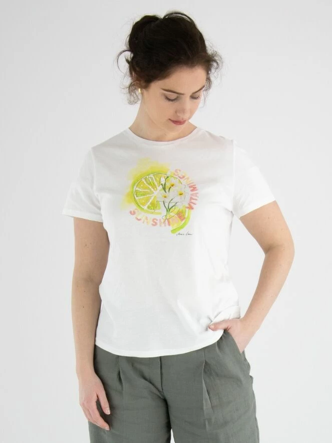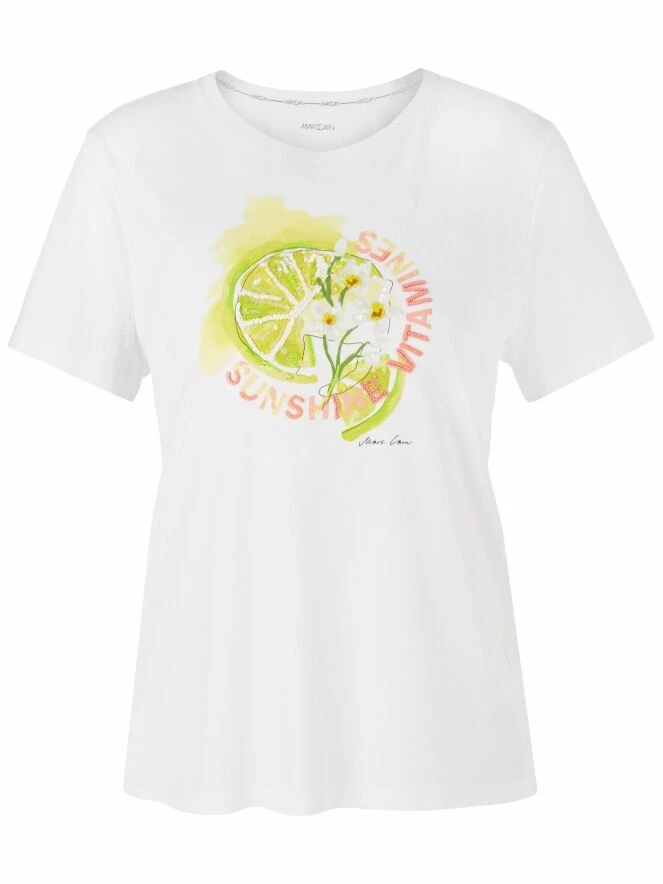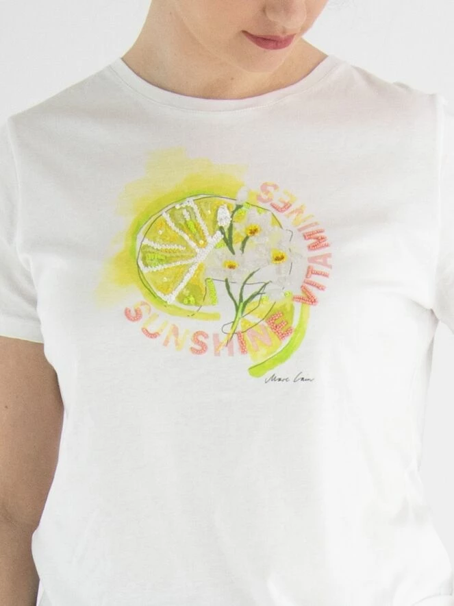 Un t-shirt de Marc Cain de couleur blanche avec une impression d’une tranche de citron vert sur le devant. Des sequins décoratifs sont incorporés dans l’impression. Le t-shirt a un col rond et des manches courtes. Ce t-shirt peut être lavé à 30 degrés.