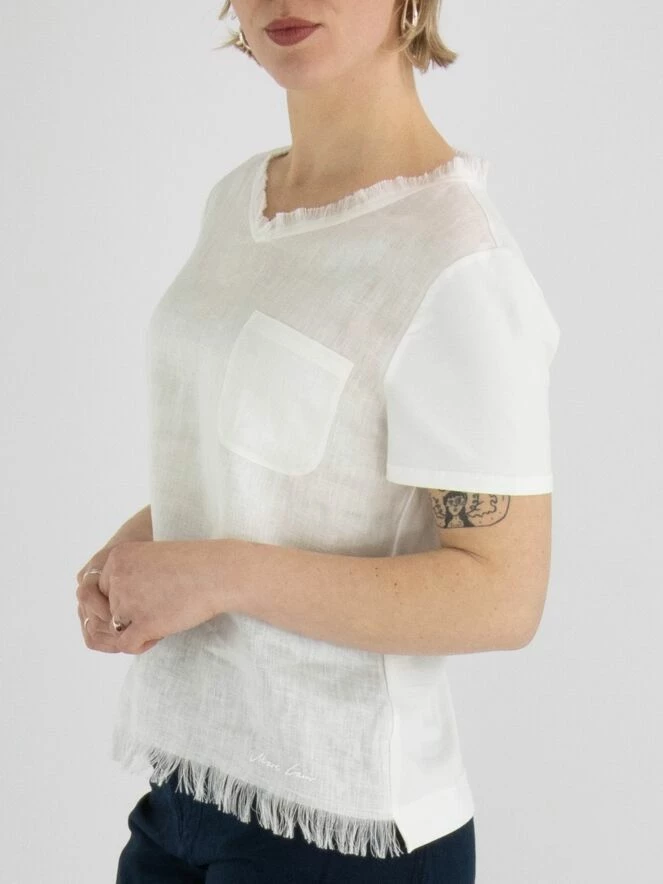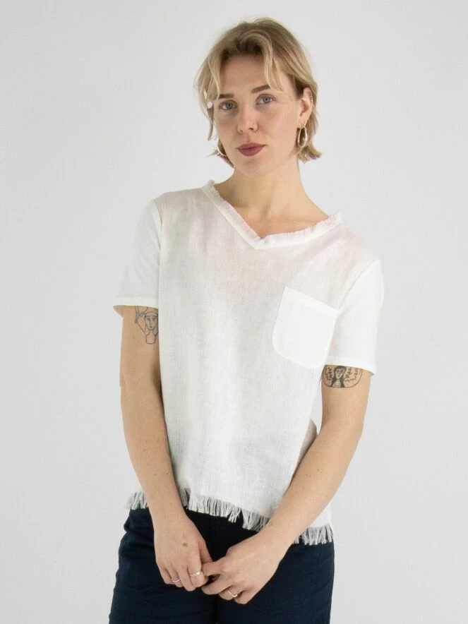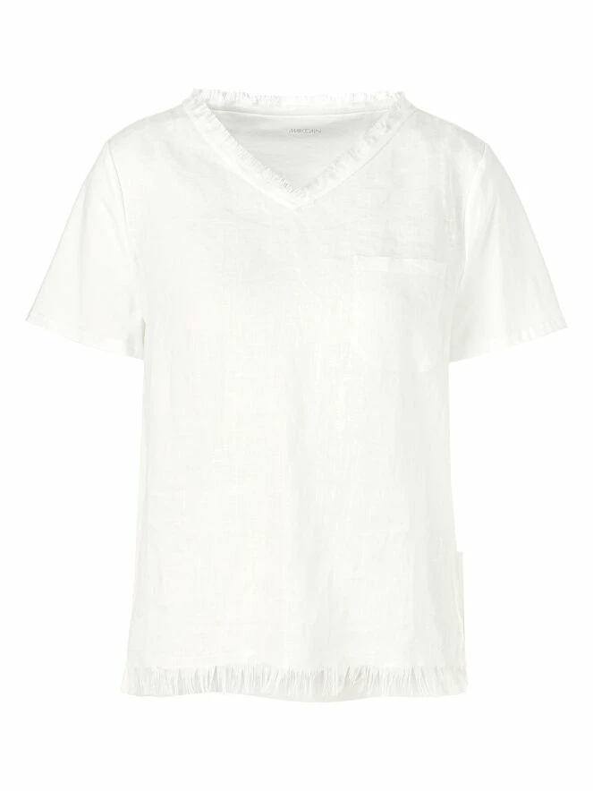 Un chemisier de Marc Cain de couleur crème. Des franges ornent les bords de l’encolure en V et du bas. Le chemisier a des manches courtes et peut être lavé à 30 degrés.