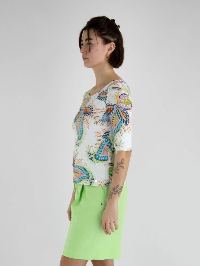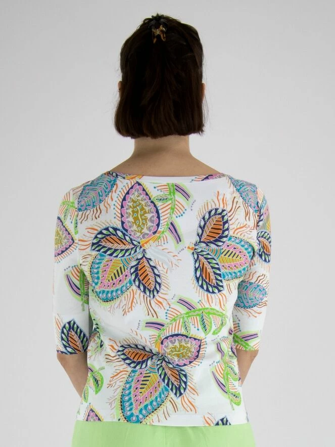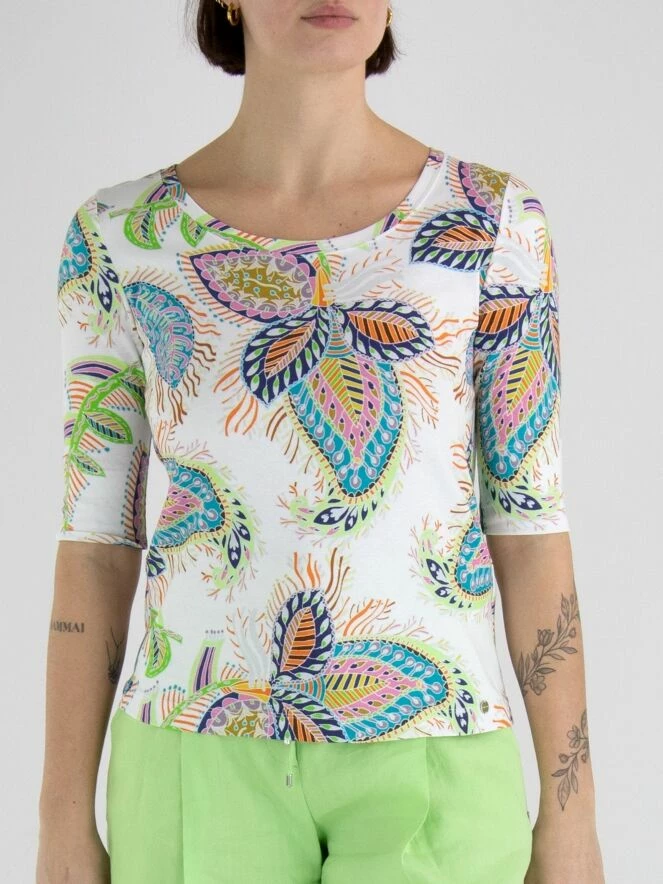 Un t-shirt de Marc Cain avec une impression de feuilles multicolores sur un fond crème. Le t-shirt a des manches courtes et un col rond. Ce t-shirt peut être lavé à 30 degrés.