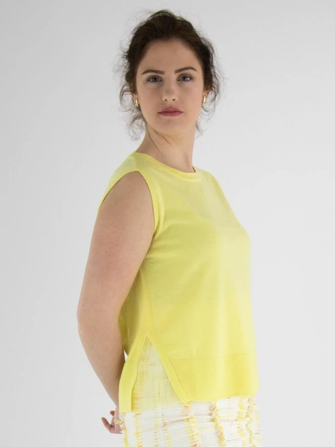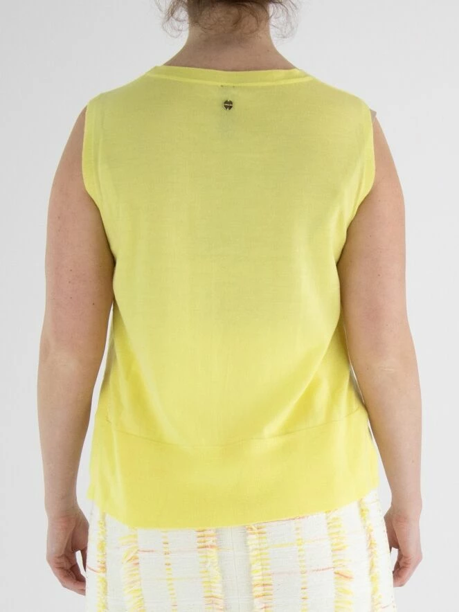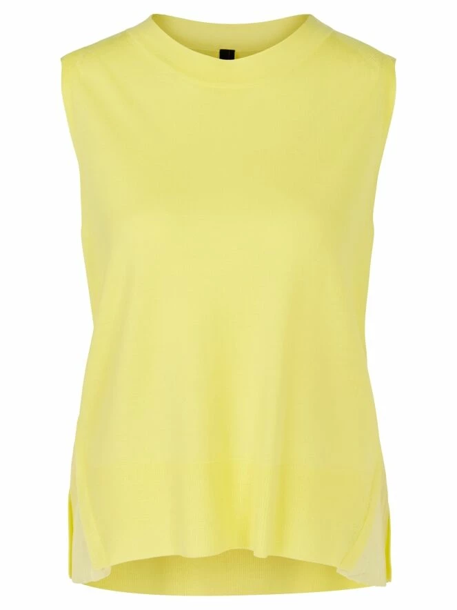 Un top de Marc Cain dans une couleur jaune douce. Le top a un col rond, et en bas, il y a une large bordure finement côtelée. Les côtés ont une fente profonde en bas, remplie d’un tissu en crêpe de voile finement plissé. Ce top peut être lavé à la main.