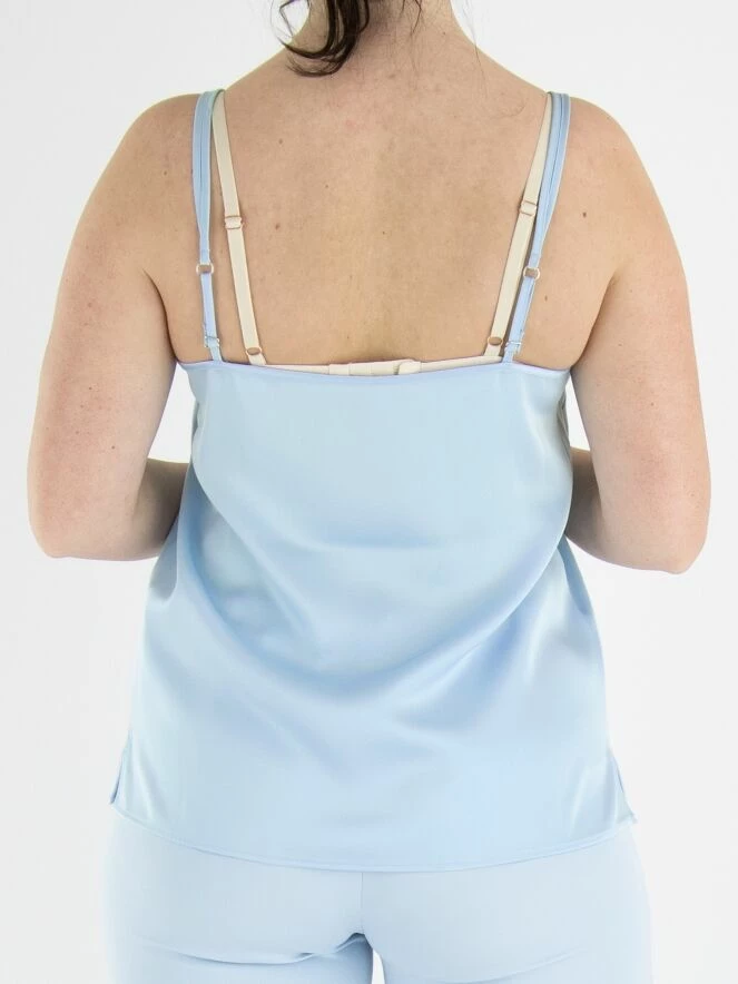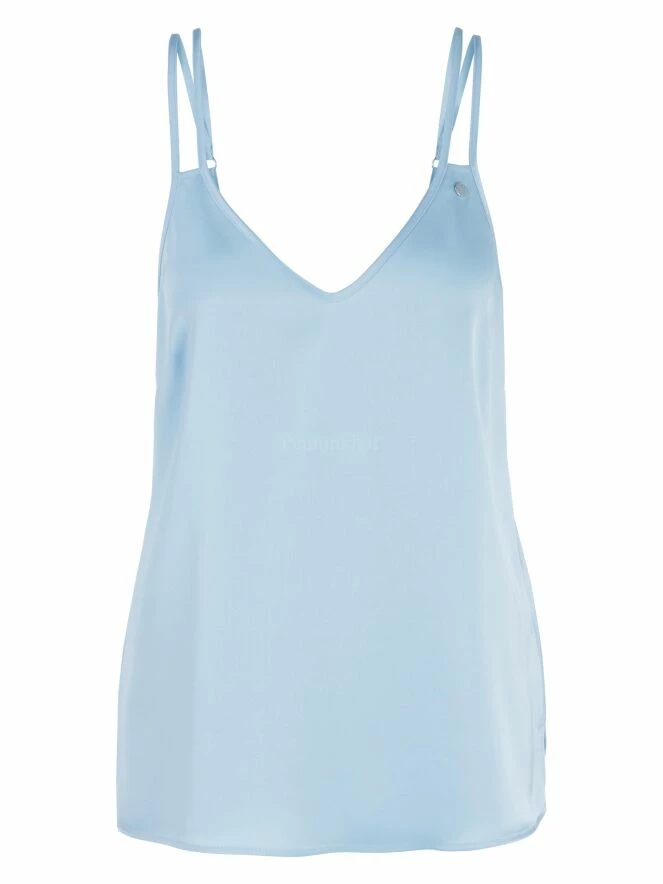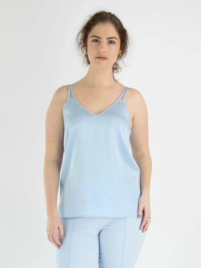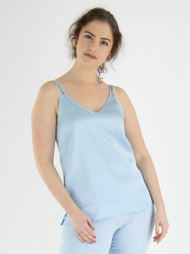 Top de Marc Cain de couleur bleu lavande à reflets mats. Le top a un col en V et des bretelles spaghetti doubles. Ce top peut être lavé à 30 degrés.