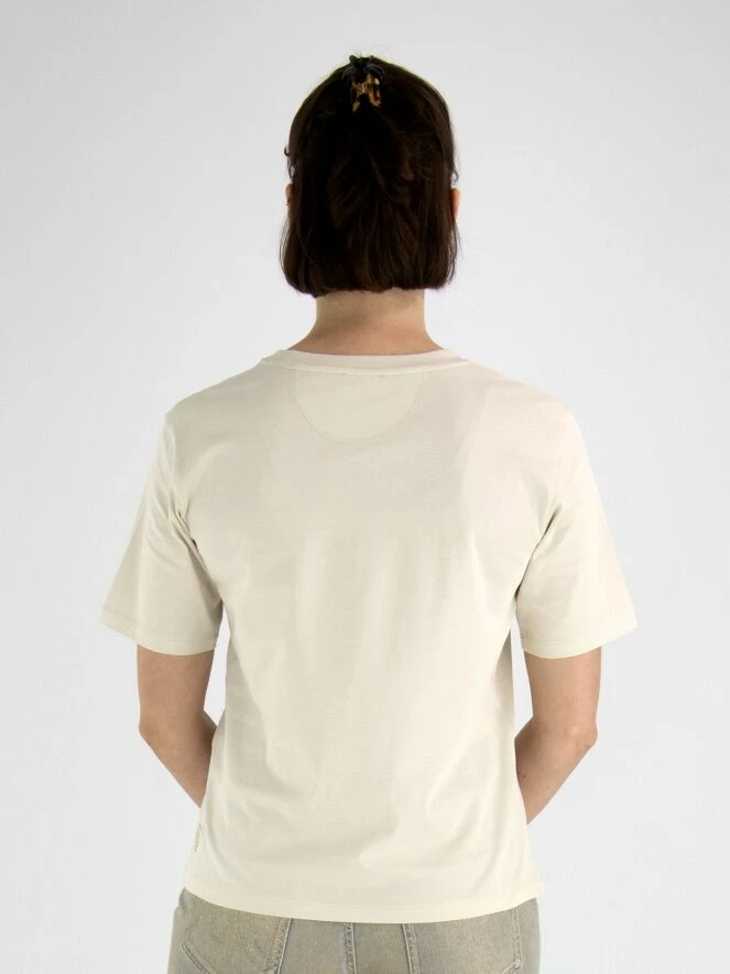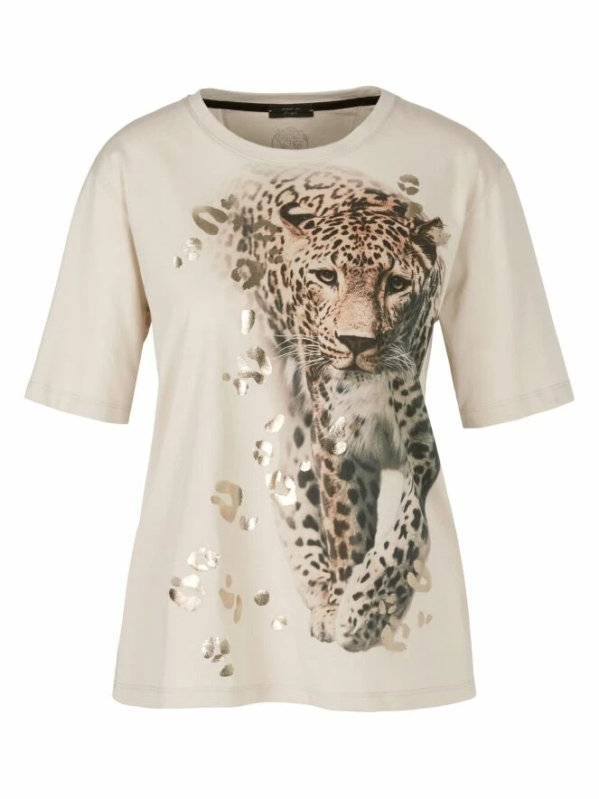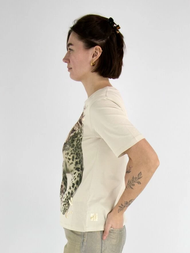 Un chemisier de Marc Cain avec une impression d’une panthère marchant avec des détails dorés sur un fond beige. Le chemisier a un col rond et des manches courtes. Ce chemisier peut être lavé à 30 degrés.