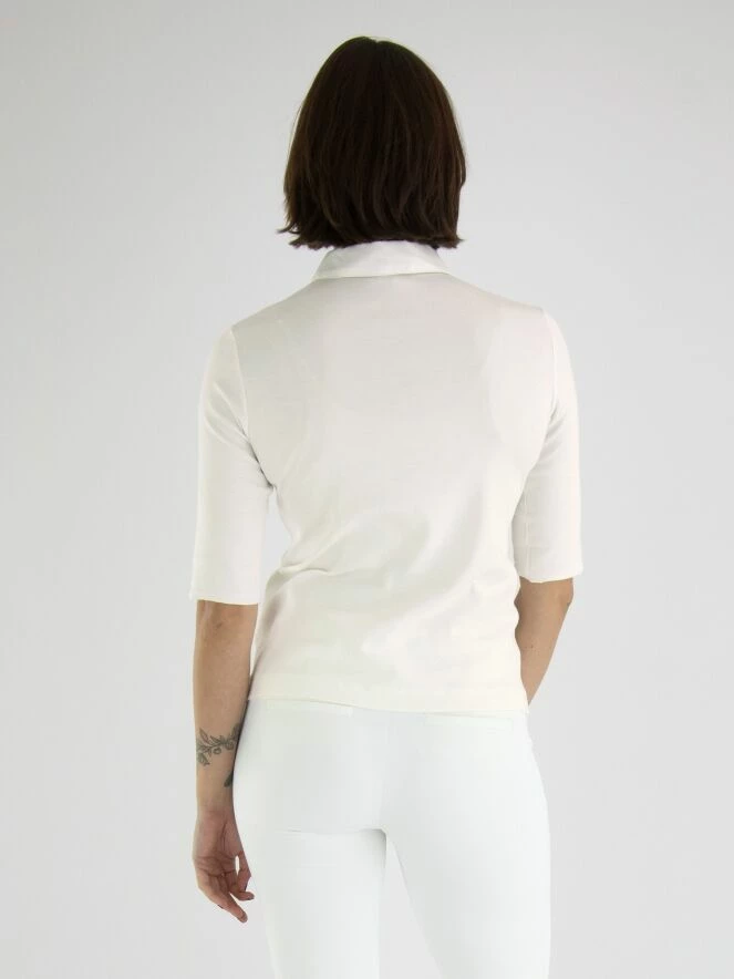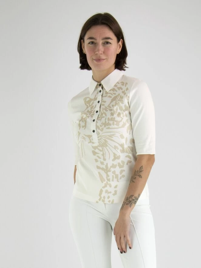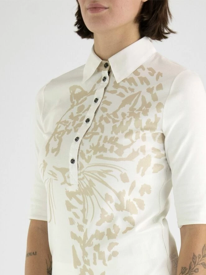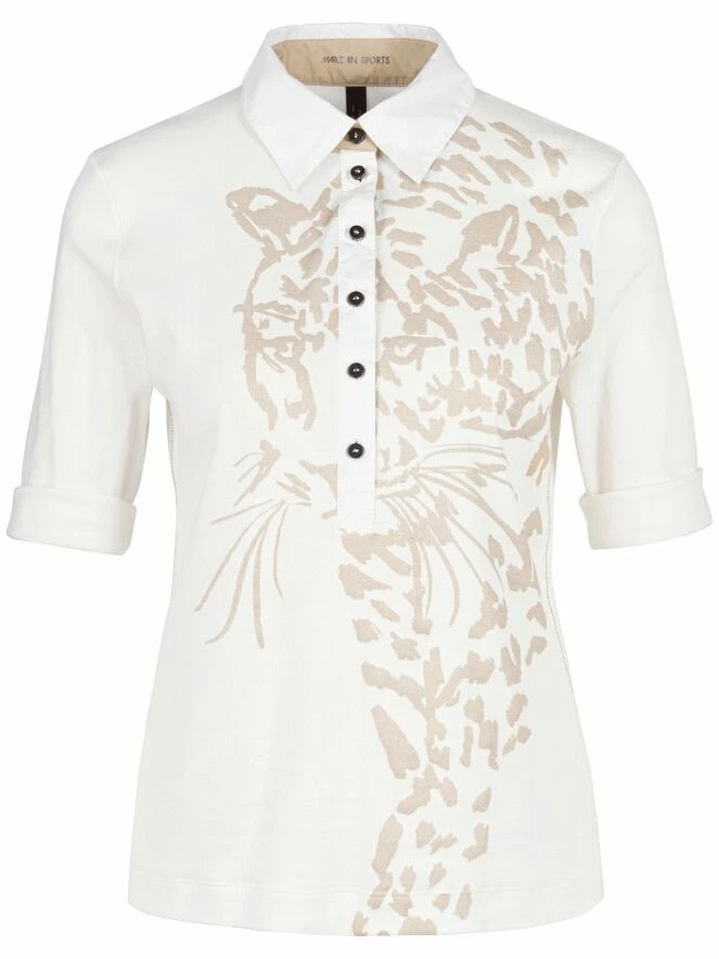 Un polo de Marc Cain en blanc crème avec une impression graphique d’un panthère en couleur sable sur le devant. Le polo a un col rond et des manches courtes. Ce polo peut être lavé à 30 degrés.