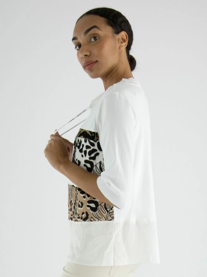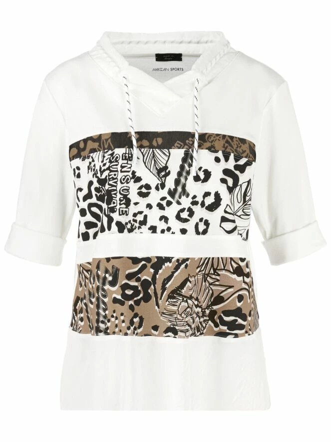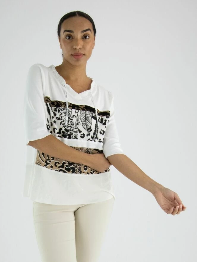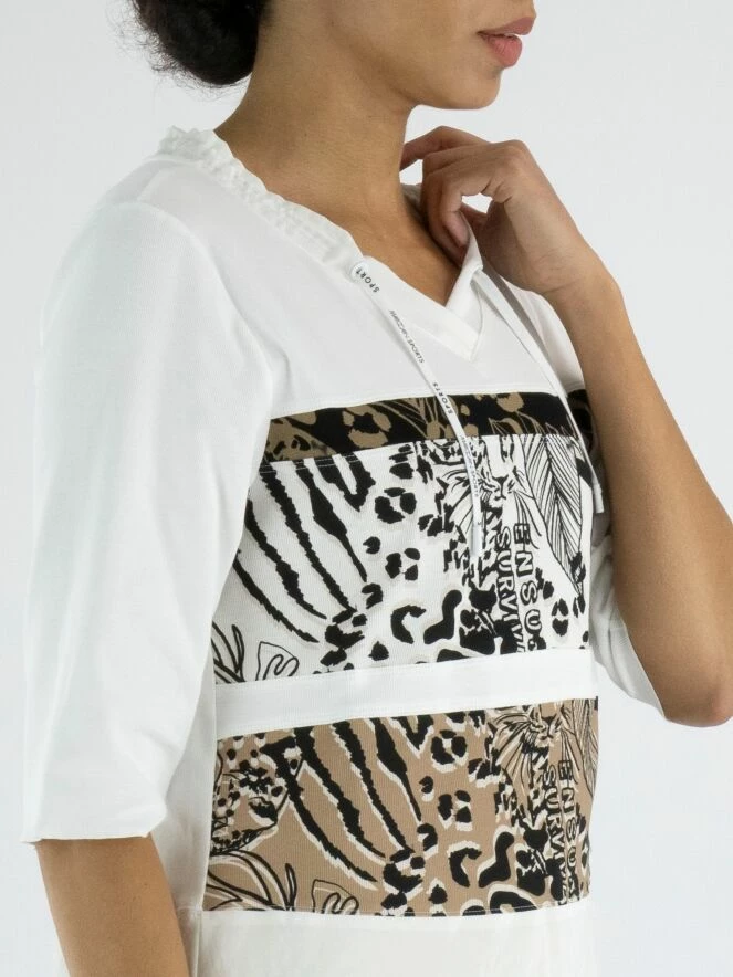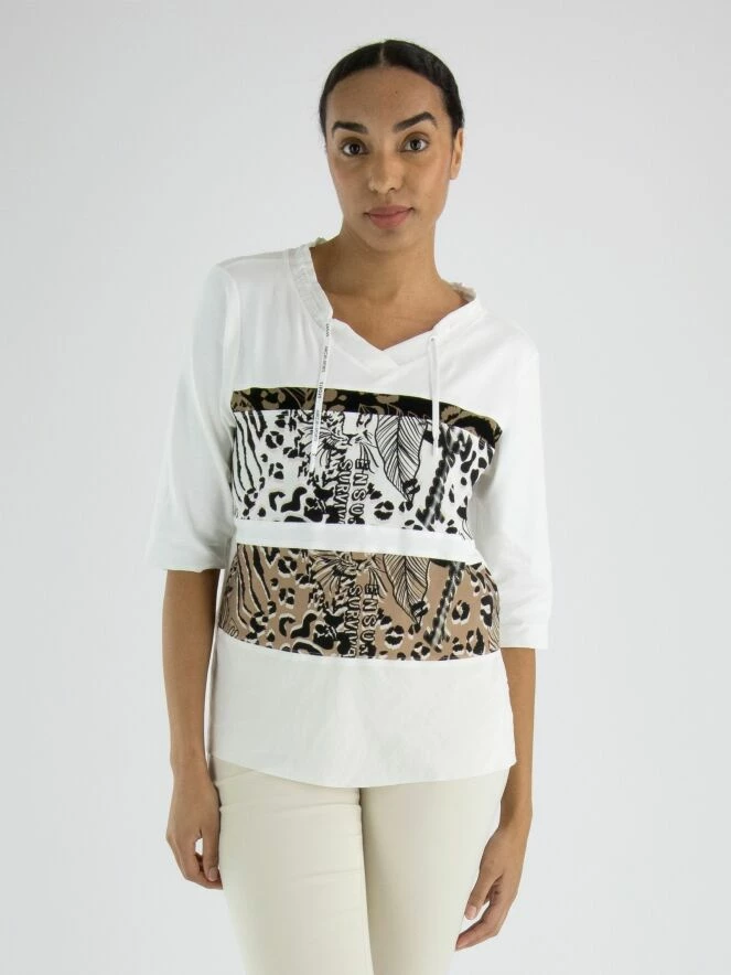 Un chemisier crème blanc de Marc Cain avec à l’avant deux larges bandes aux imprimés graphiques en couleurs camel et crème blanc combinées avec du noir. Le long du col se trouve une bordure en satin mat avec un cordon dans une finition tunnel. En dessous des imprimés, il y a un tissu en satin mat. L’arrière est de couleur crème blanc uni. Ce chemisier peut être lavé à 30 degrés.