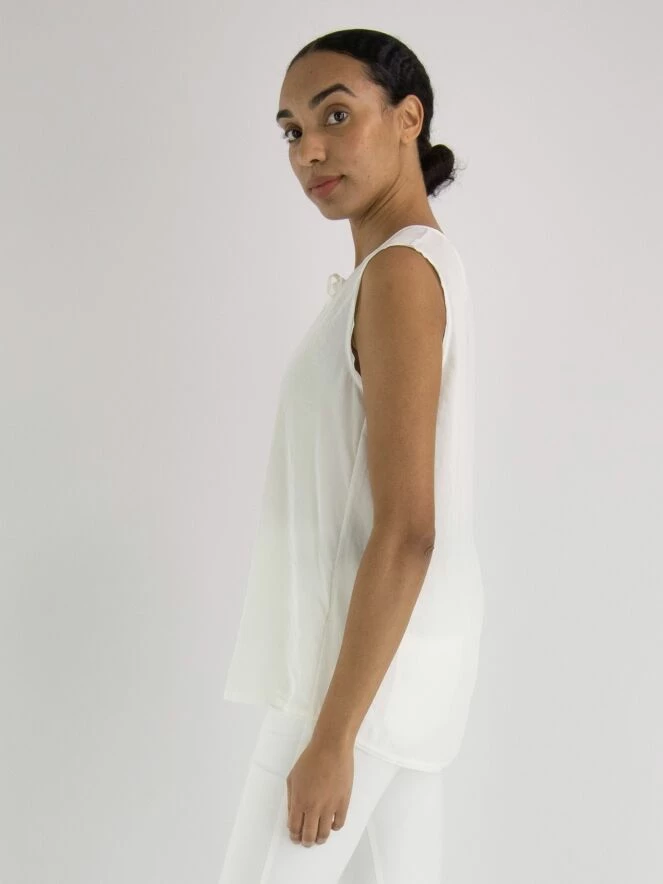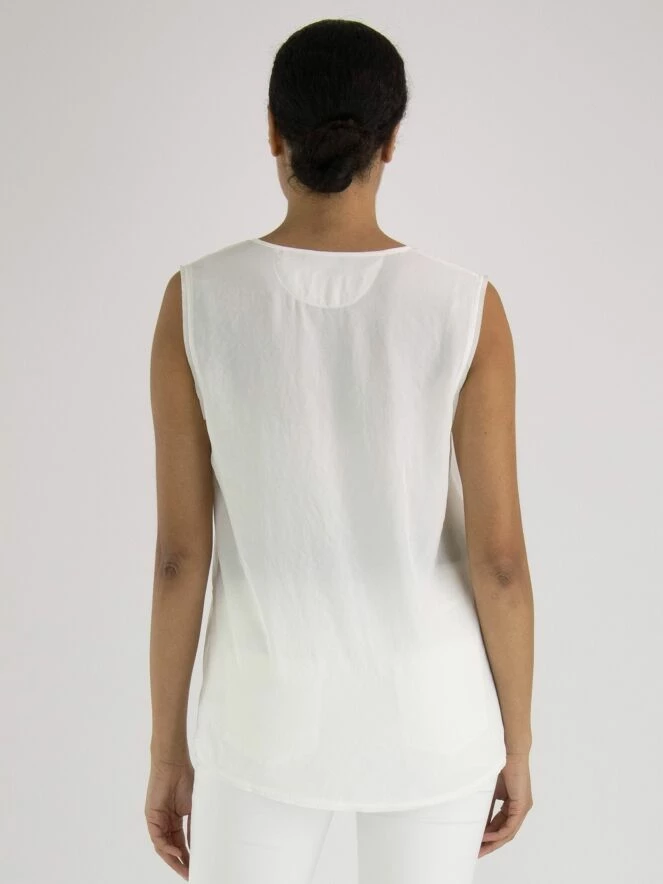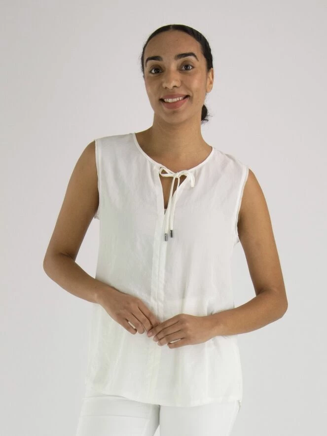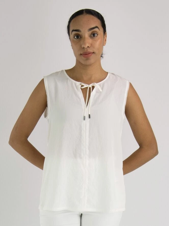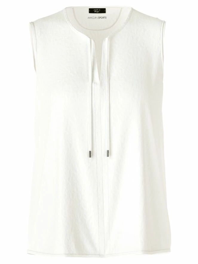 Un top de Marc Cain en blanc crème. Au milieu du col rond, il y a une découpe en V avec deux cordons. De cette ligne en V, il y a trois lignes de couture descendant jusqu’au bas du top. Ce top peut être lavé à 30 degrés.