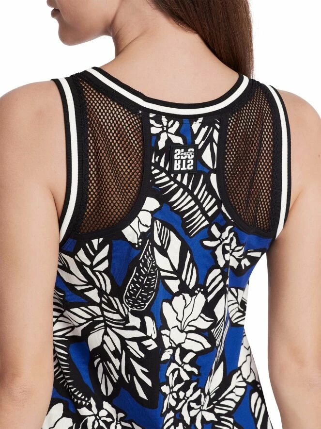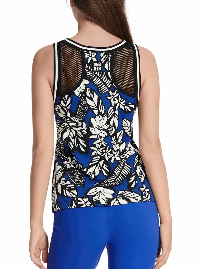 Un top de Marc Cain avec un imprimé graphique de fleurs avec des feuilles en bleu cobalt, blanc et noir. Les bretelles sont dans une structure de filet ouvert. Le long des bords du col rond et des emmanchures se trouve une bordure en tricot finement côtelée et rayée. Ce top peut être lavé à 30 degrés.