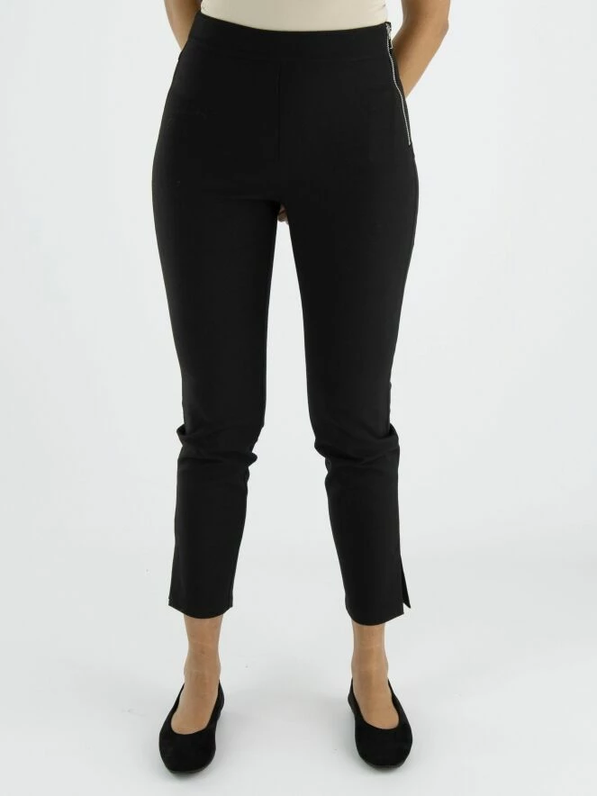Un pantalon de Marc Cain en noir. À l’arrière de la taille, il y a une bande élastique avec le texte « Marc Cain Sports ». Il y a une fermeture éclair sur le côté. Ce pantalon peut être lavé à 30 degrés.