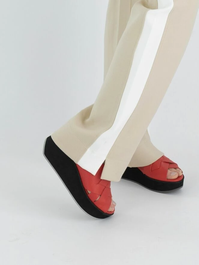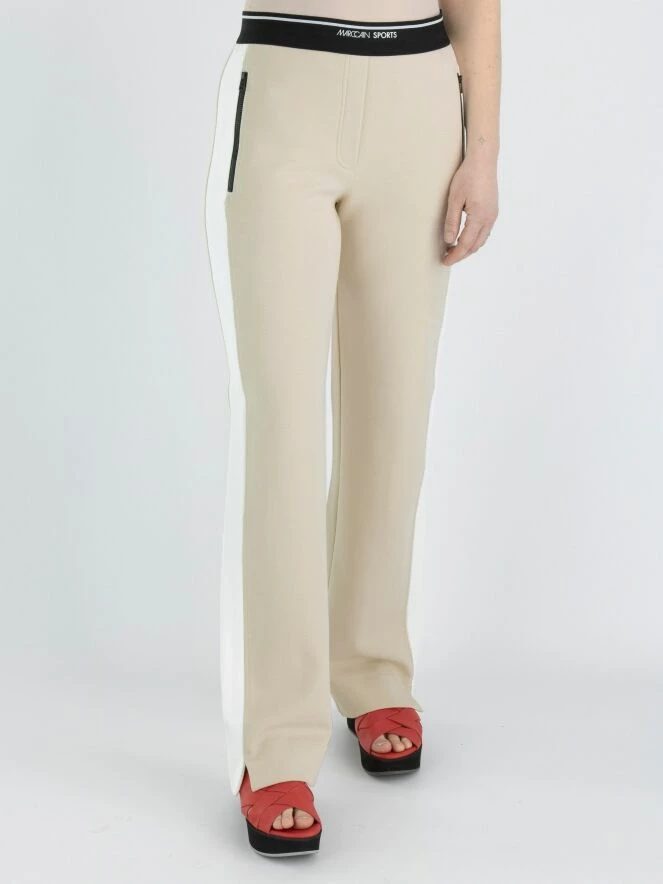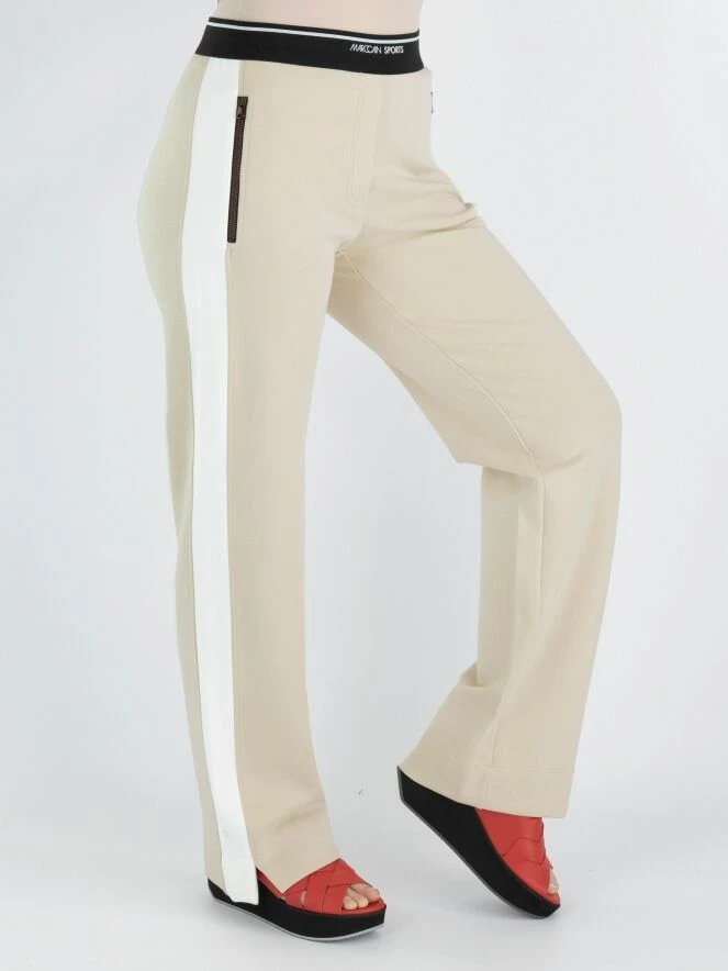 Pantalon Marc Cain de couleur sable. La taille est dotée d’une bande élastique de couleur noire avec une bande de couleur sable. Les poches sont fermées par une fermeture éclair. Ce pantalon peut être lavé à 30 degrés.