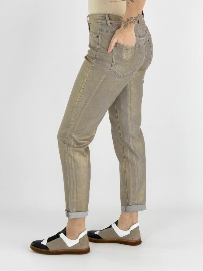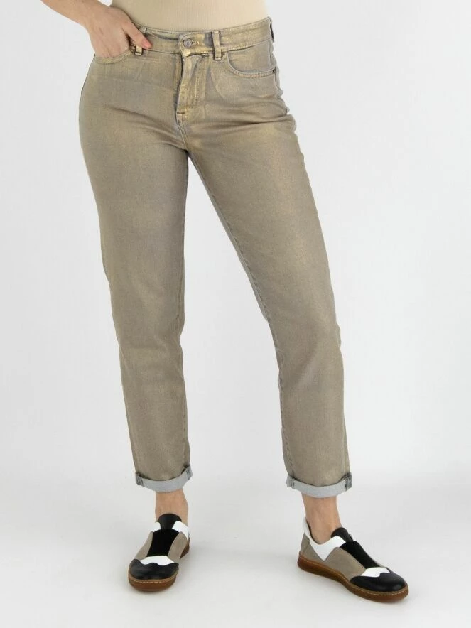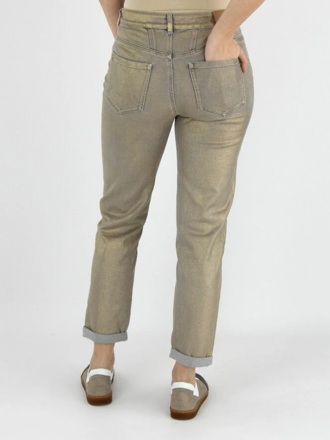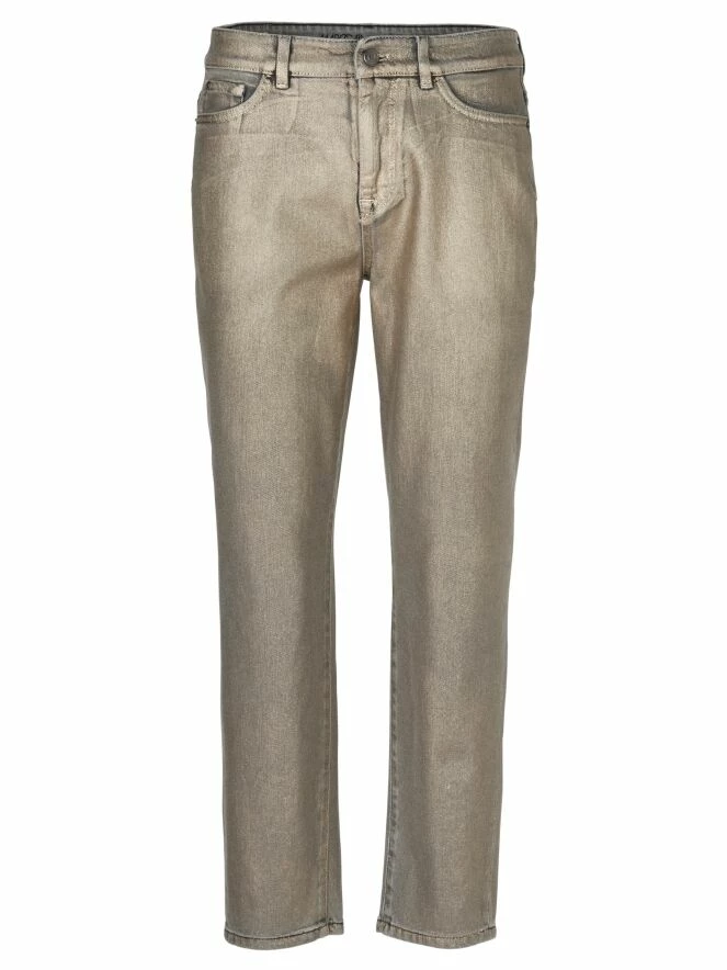 Un jean de Marc Cain de couleur dorée. Le jean est de style 5 poches et a un revers court au bas des jambes. Ce jean peut être lavé à 30 degrés.