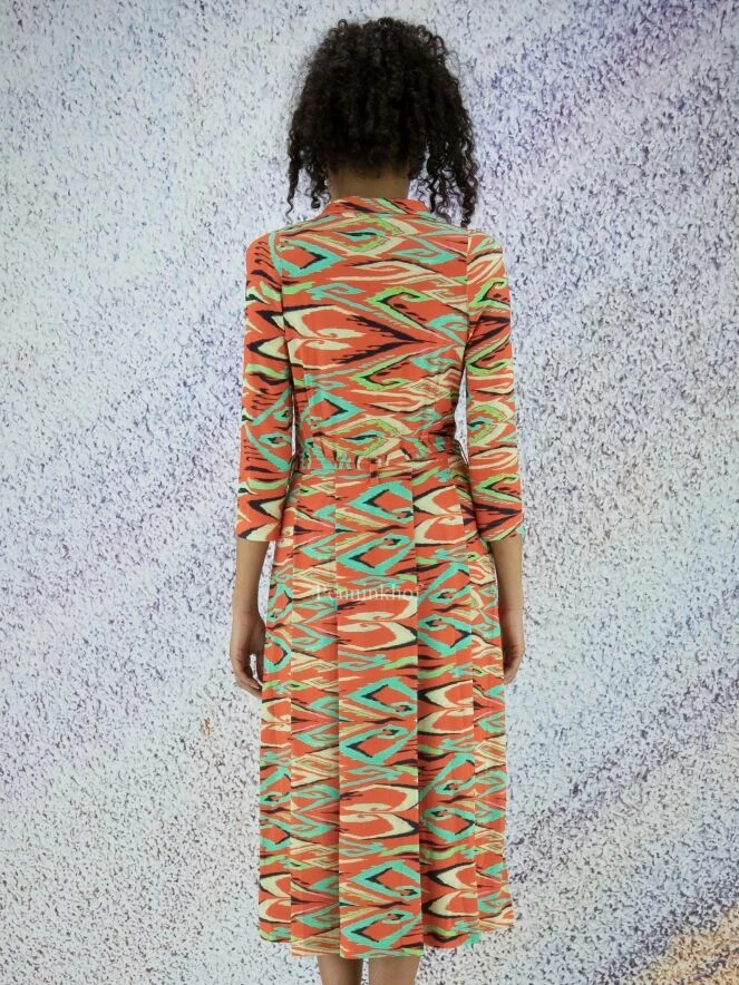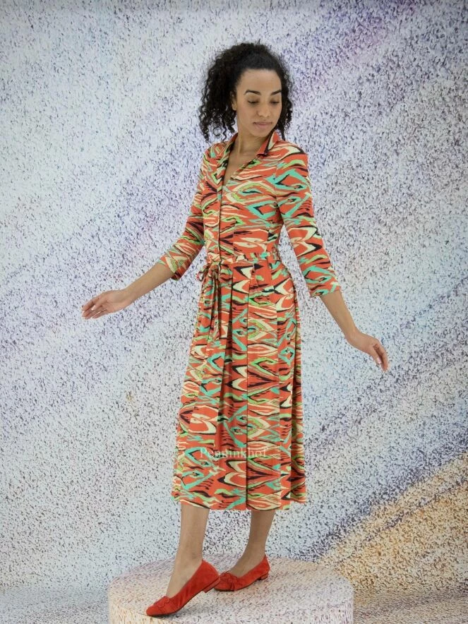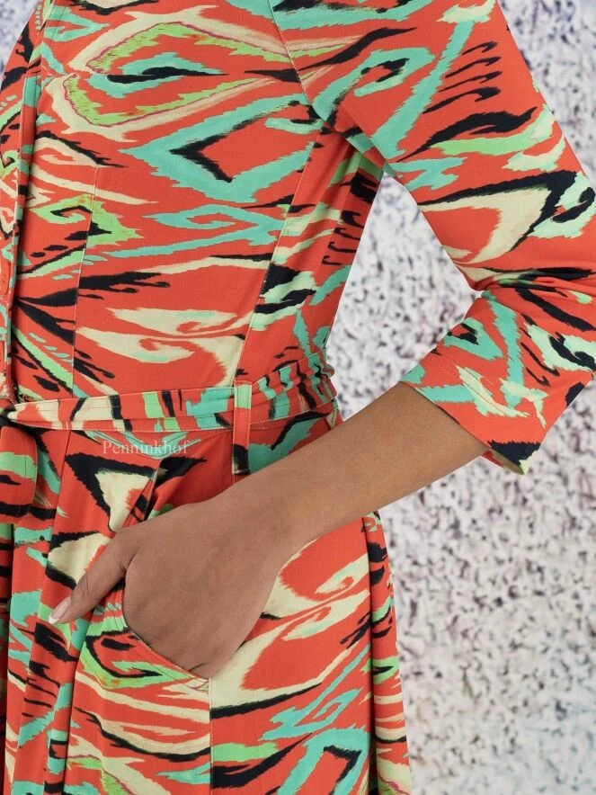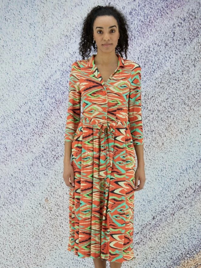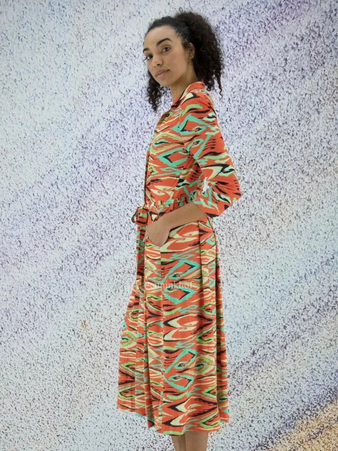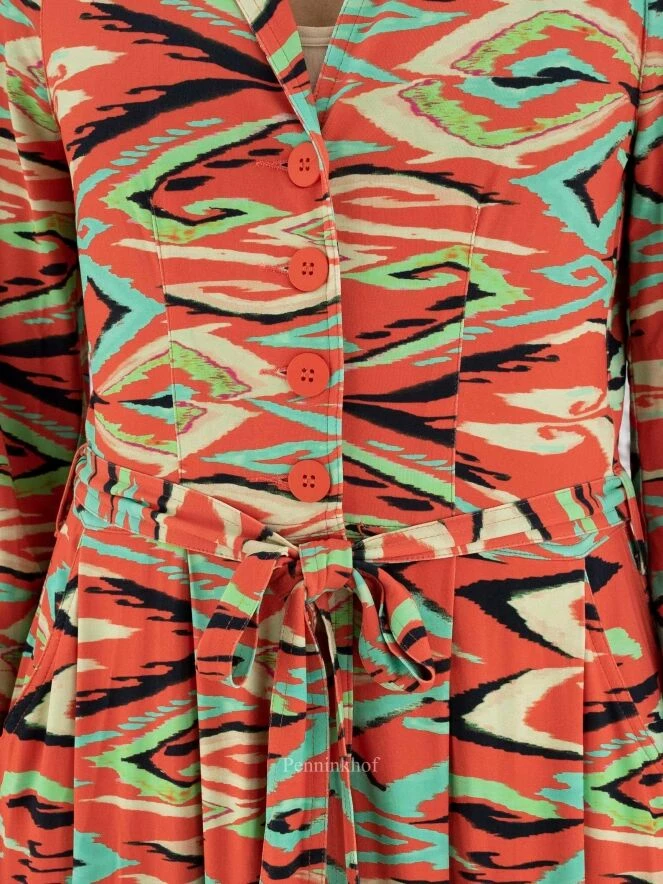 Robe boutonnée de la marque ML Collections, à imprimé graphique flamboyant aux multiples nuances de vert, de noir et de vanille sur un fond rouge corail. À partir de la taille, la robe prend une légère ligne A. Elle est dotée de poches latérales à la taille. Lavage déconseillé.