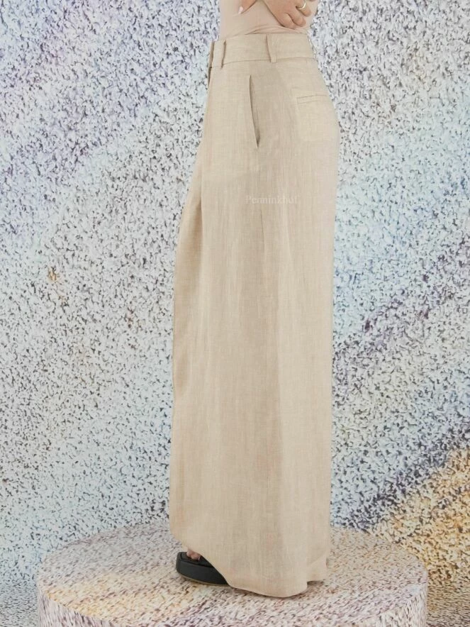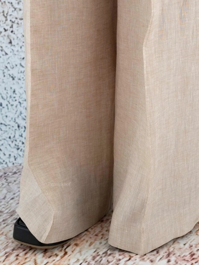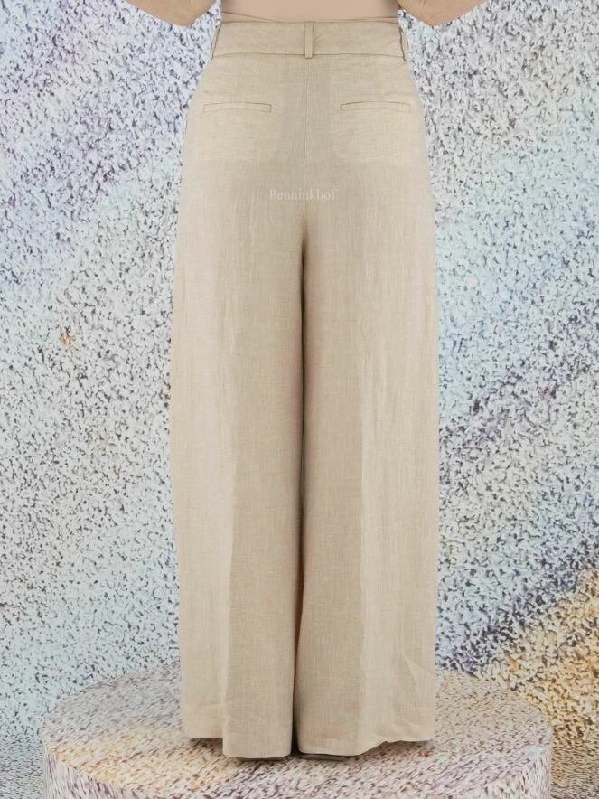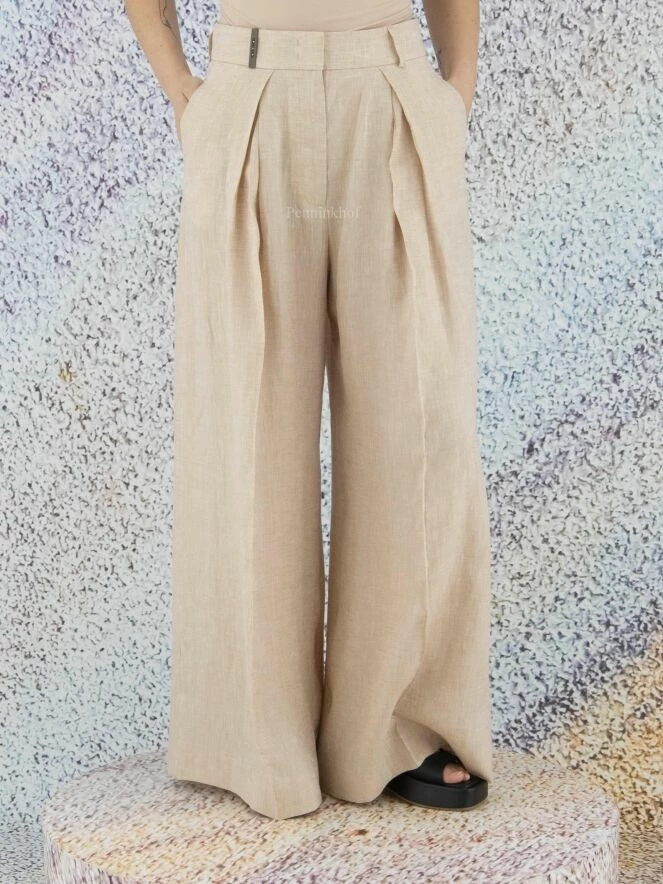 Pantalon ample de couleur sable clair, de la marque Peserico. Quelques plis sous la taille donnent du volume à la jambe. Le pantalon est doté de poches latérales. Lavage à la main.