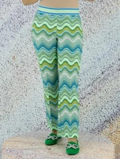 Pantalon Peserico à fines rayures blanc crème sur un fond couleur bleu nuit. La taille est équipée d’une bande élastique froncée dans le dos. Le devant de la jambe est orné de plis à bande unique des deux côtés et d’un pli inséré au milieu de la jambe. Un large revers est présent au bas des jambes. Lavage déconseillé.