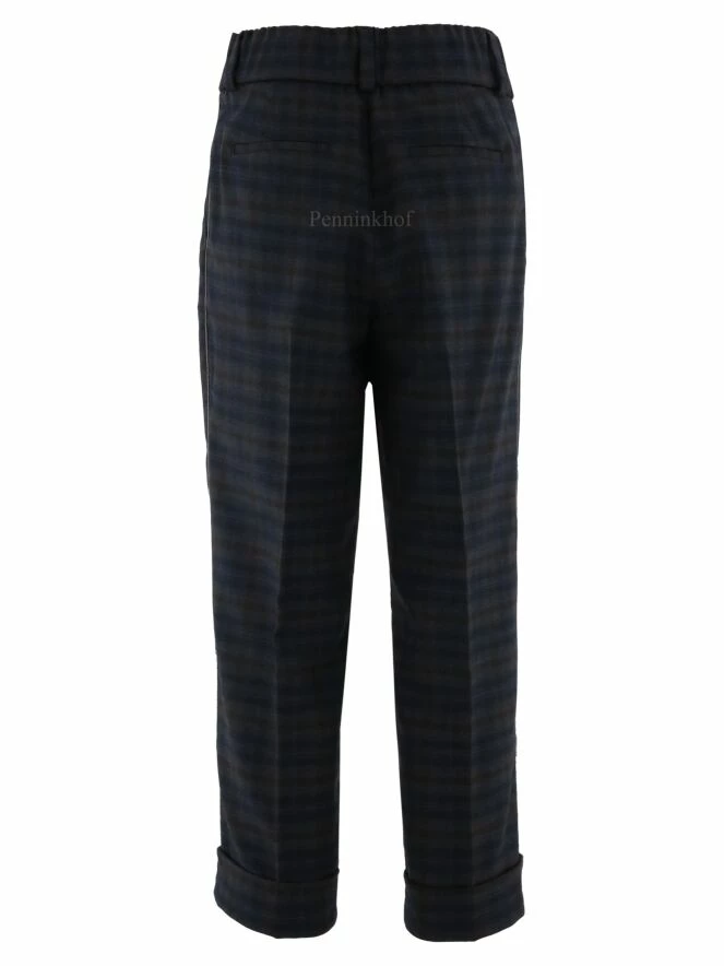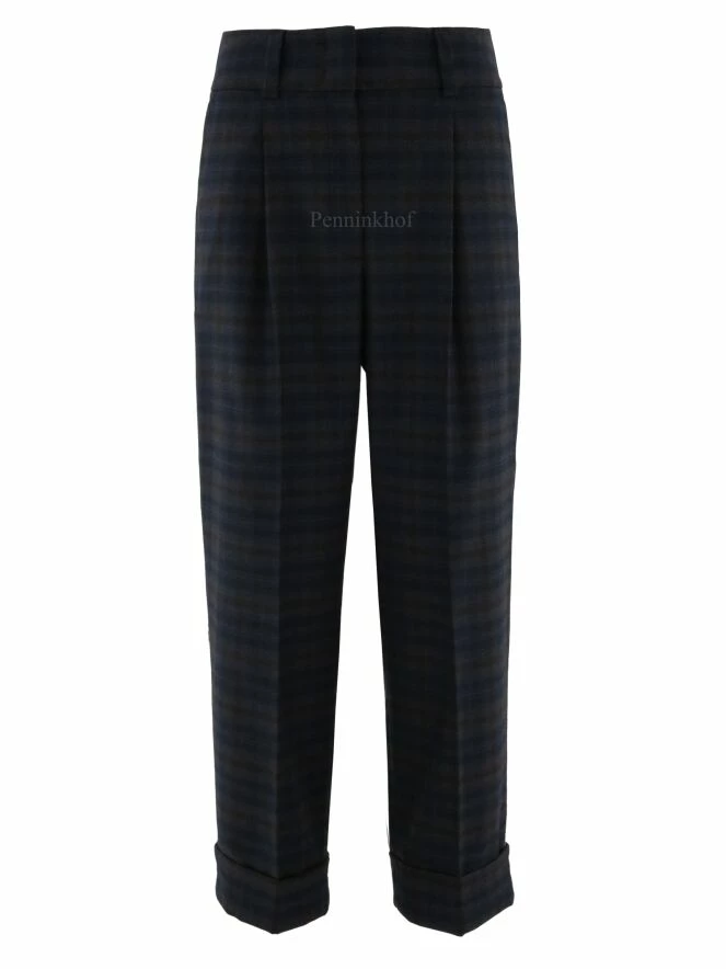 Pantalon large de la marque Peserico, à imprimé de carreaux aux multiples nuances de bleu foncé et de brun. Au dos, la taille est équipée d’une bande élastique à fronces. Le bas des jambes présente de larges revers. Une garniture de strass argentée orne l’intérieur des jambes. Lavage déconseillé.