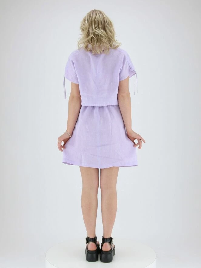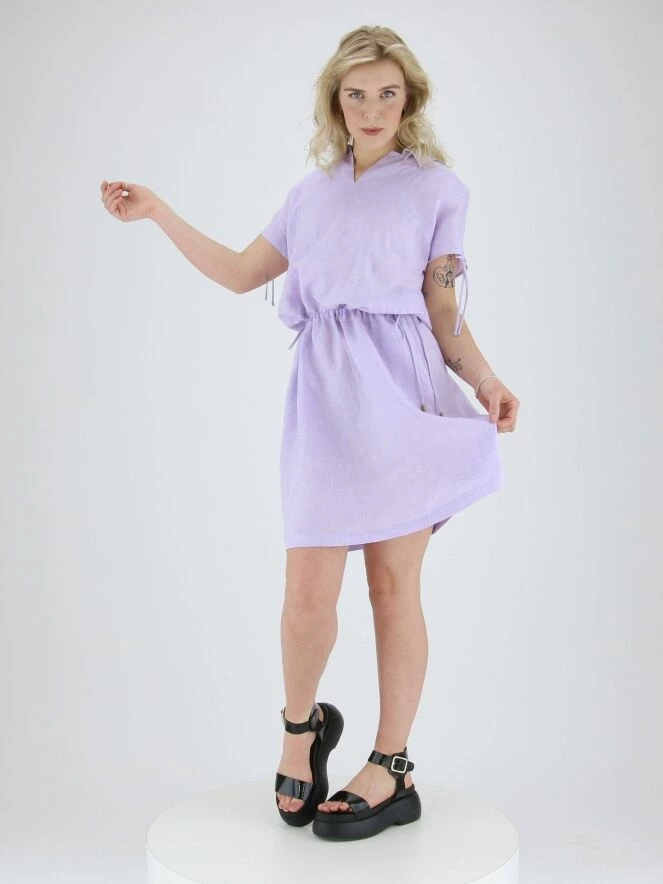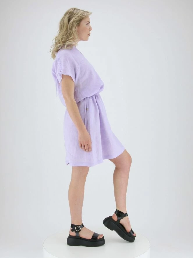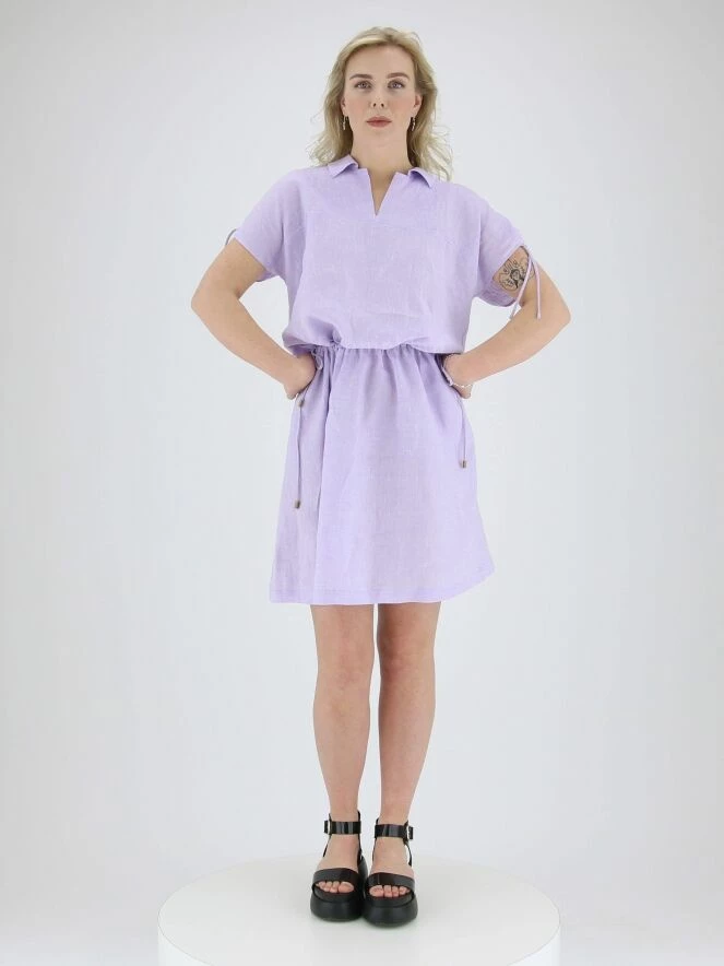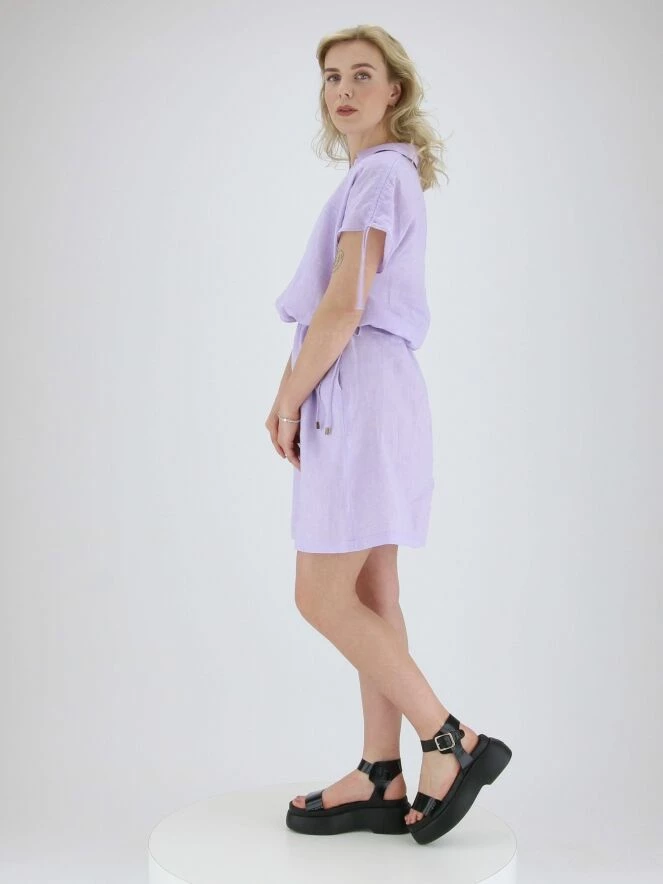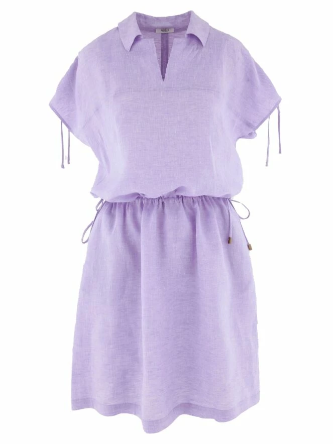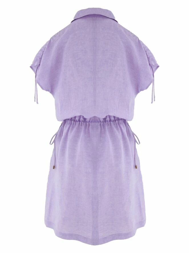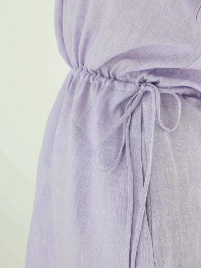 Robe sans manches de la marque Peserico, dans un coloris lilas mélangé. Un petit cordon remonte les manches jusqu’aux épaules avec un effet plissé. La taille est dotée d’un cordon sous tunnel qui peut être froncé par le côté. Lavage à 30 degrés.