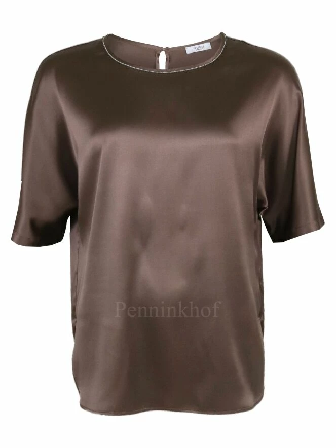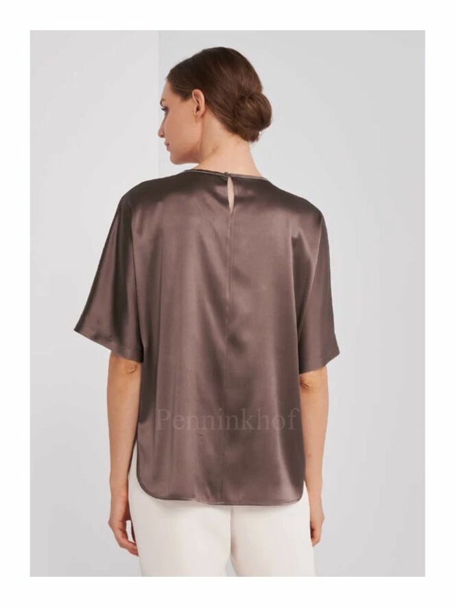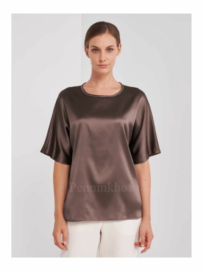 Luxueuse chemise en soie de la marque Peserico, de couleur brun moka. Le bord du col rond est orné d’un fin passepoil en strass. La fermeture à bouton dans le dos laisse apparaître une petite ouverture ovale. Le bas est fendu latéralement avec des bords arrondis. Lavage à la main.