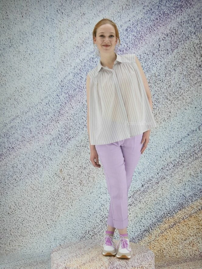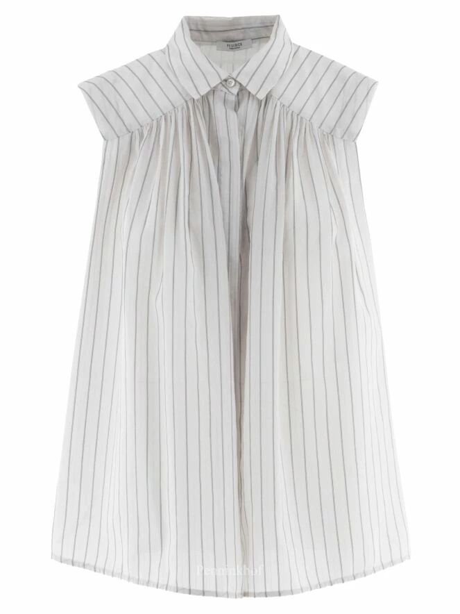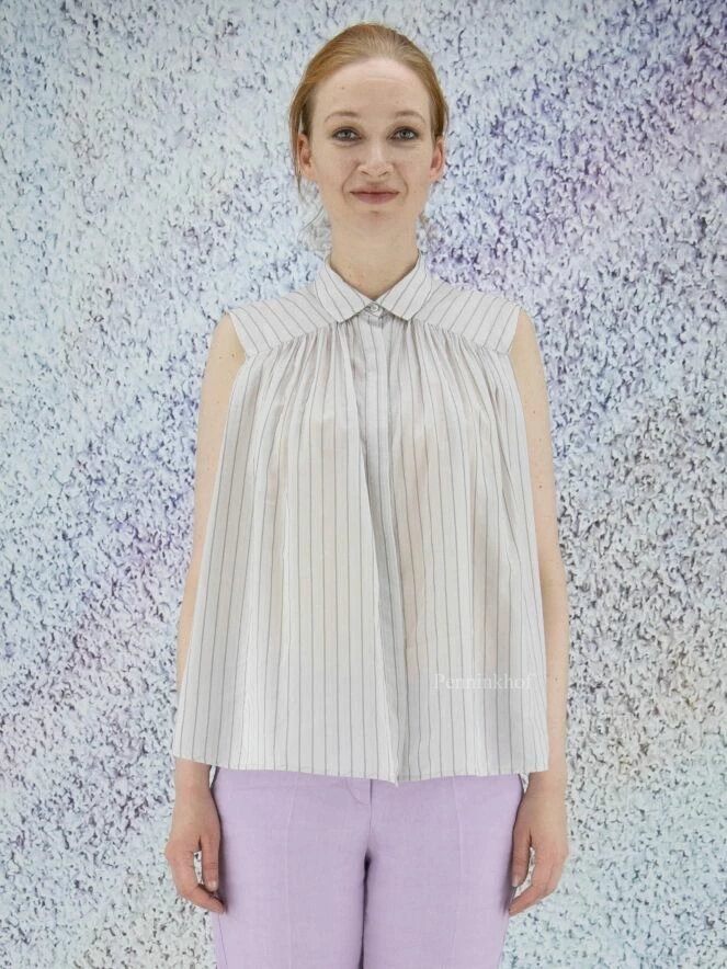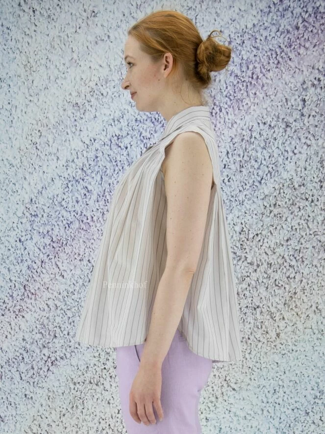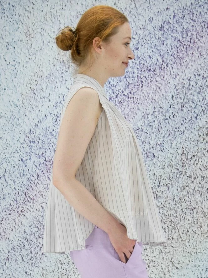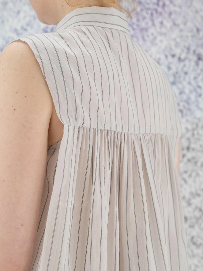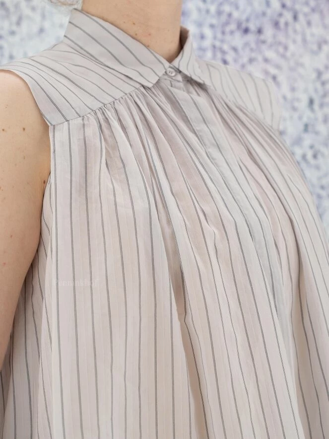 Chemisier large sans manches de la marque Peserico, à fines rayures grises sur un fond couleur blanc crème. A l’avant et à l’arrière, de nombreux plis partent des épaules pour élargir la coupe dans une ligne A. Lavage à 30 degrés.