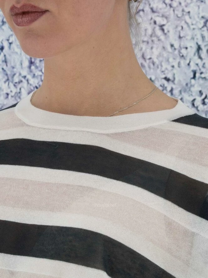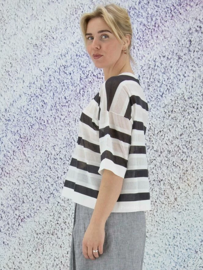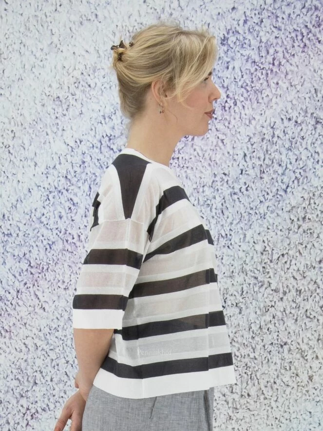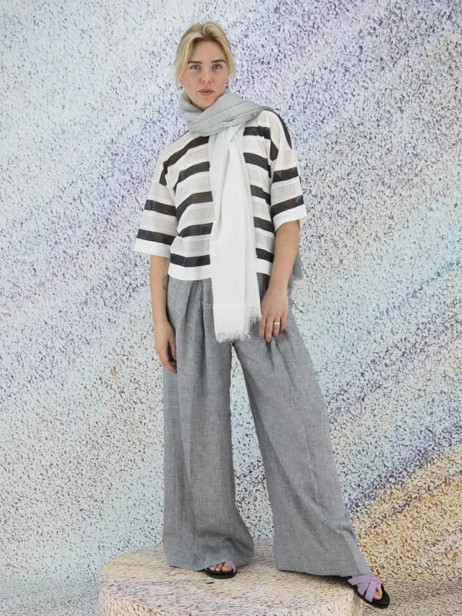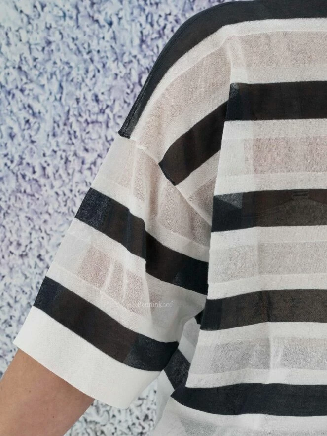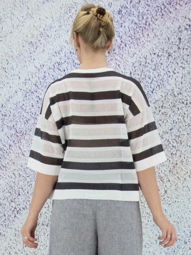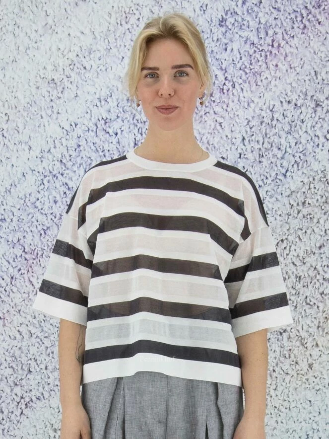 Tee-shirt ample de la marque Peserico, à larges rayures de couleur gris foncé et blanc. Le tee-shirt présente un col rond et des manches courtes tombantes. Lavage à la main.