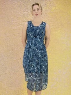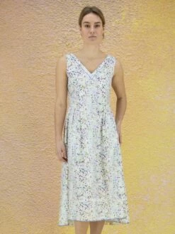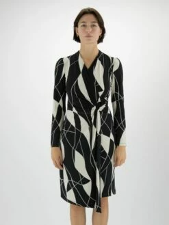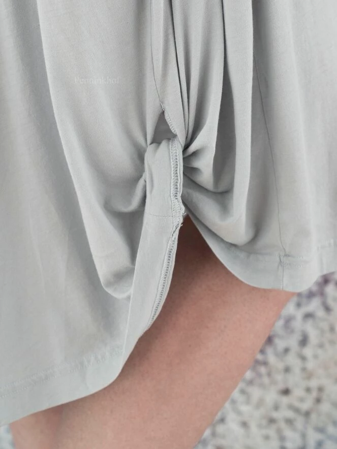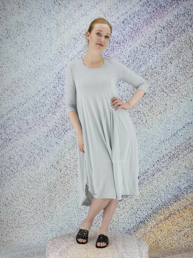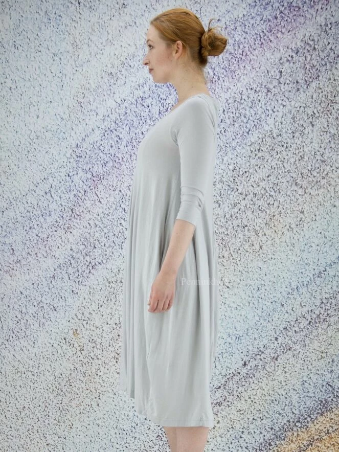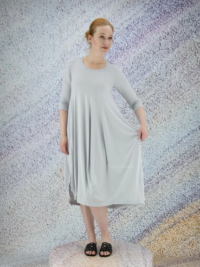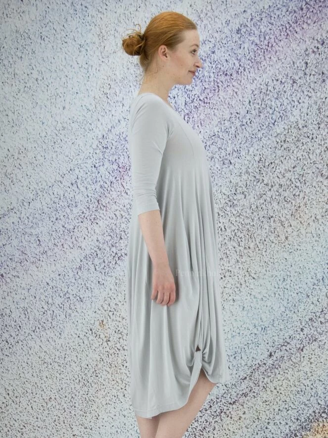 Robe à manches mi-longues de la marque Rundholz, de couleur gris clair. A partir de la taille, la robe prend une forme de ballon avec de nombreux plis. Lavage à 30 degrés.