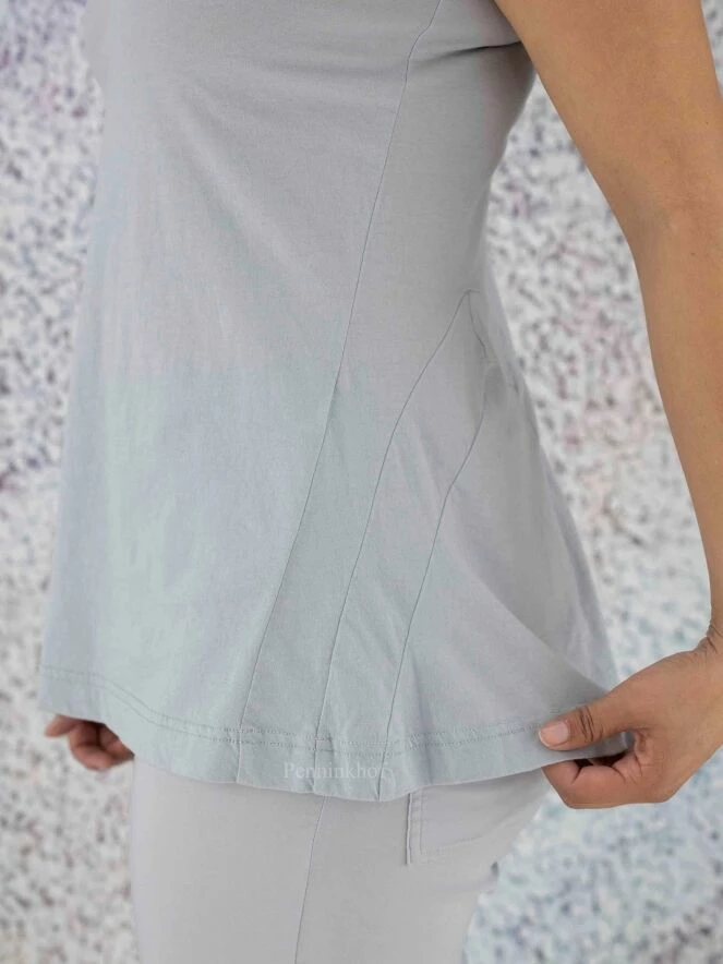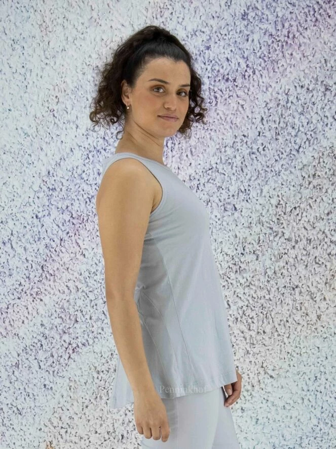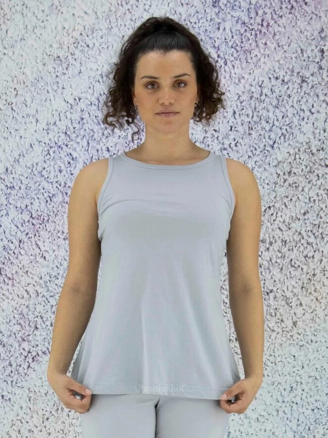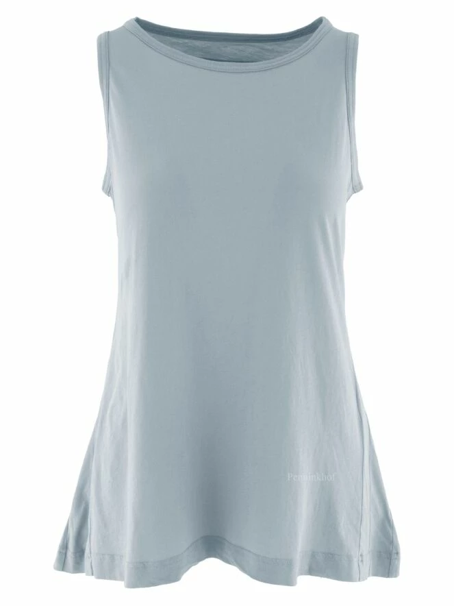 Top sans manches de la marque Rundholz black label, de couleur gris clair. La coupe en ligne A présente un col bateau et de larges emmanchures. Lavage à 30 degrés.