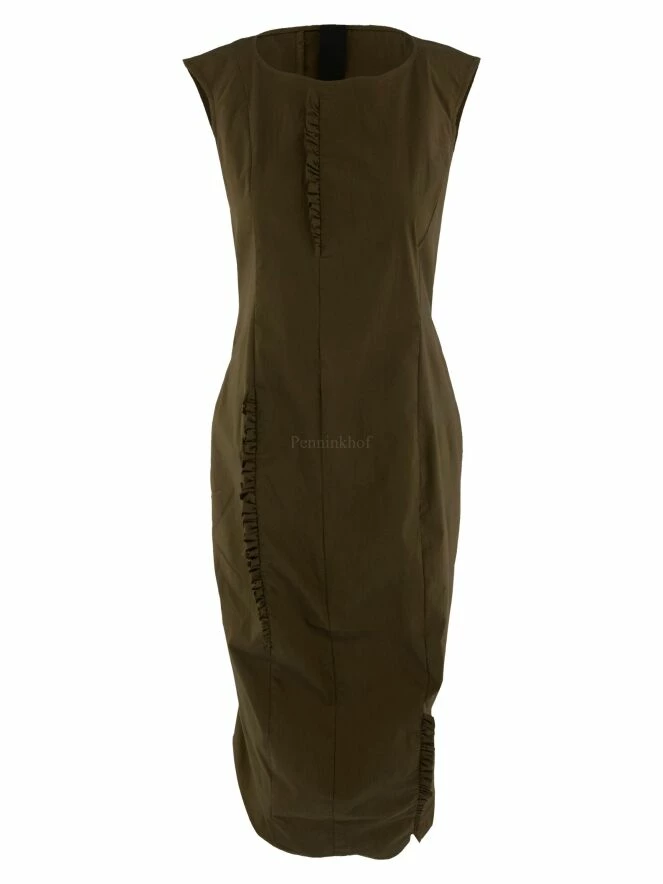 Robe de la marque noire Rundholz, de couleur vert olive. Des passepoils smockés sont présents à plusieurs endroits le long des coutures sur le devant et dans le dos. Cette robe peut être lavée à 30 degrés.