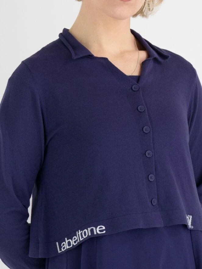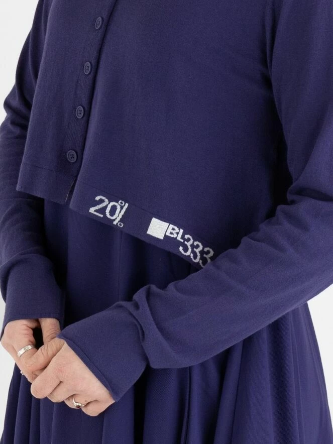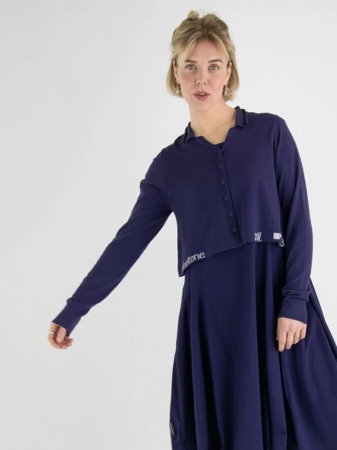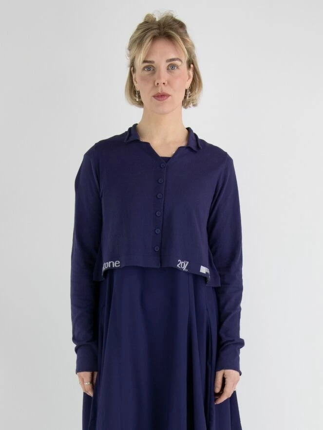 Un gilet court de Rundholz Black Label en bleu indigo. Le gilet est doté de manches longues, et il y a une impression de lettres blanches sur l’ourlet inférieur. Ce gilet peut être lavé à 30 degrés.