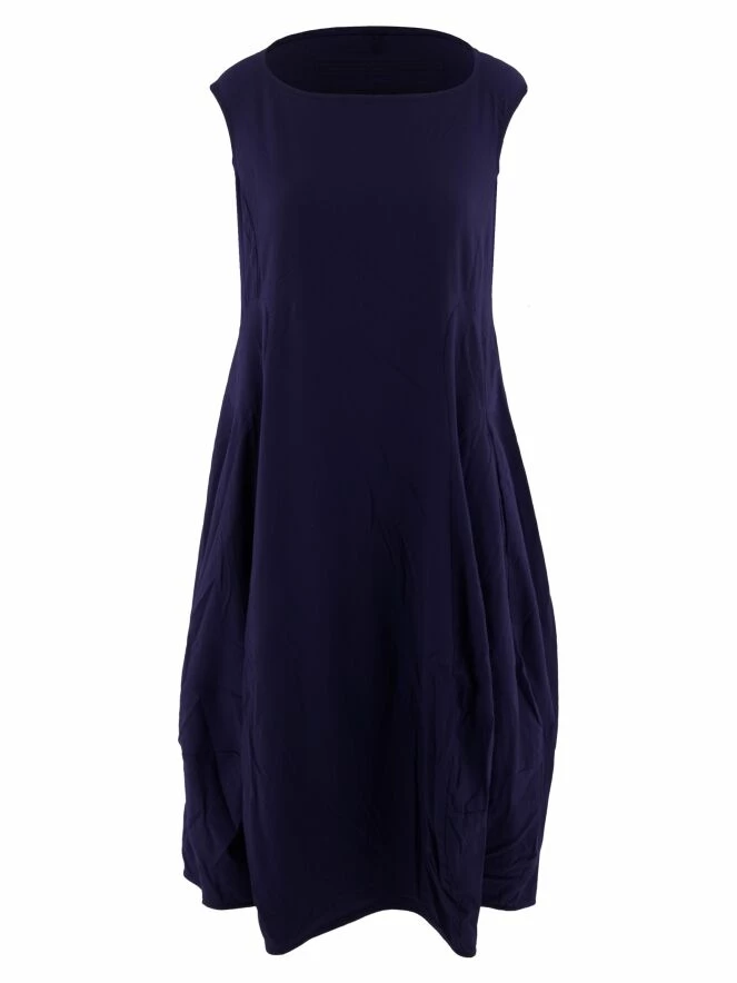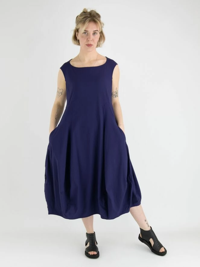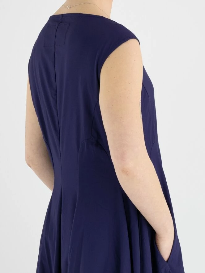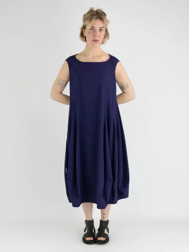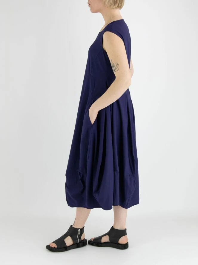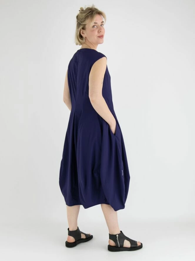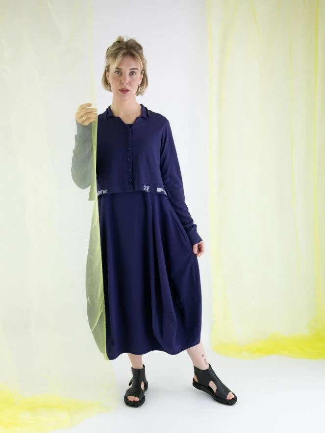 Une robe de Rundholz Black Label de couleur bleu indigo. La robe a une forme ballon à partir de la taille. Il y a des poches au niveau de la taille. La robe a un col rond et peut être lavée à 30 degrés.