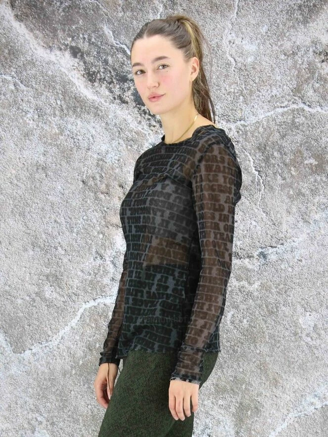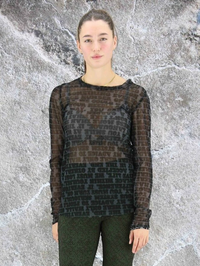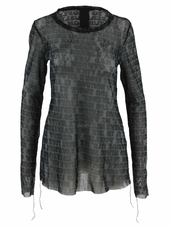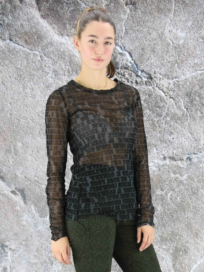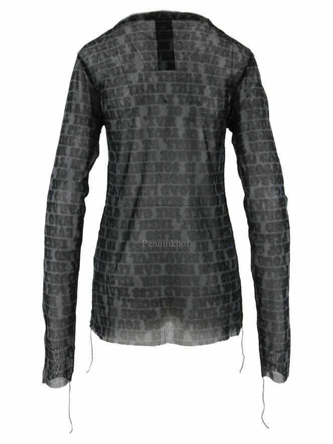 Chemise transparente de la marque Rundholz black label, à imprimé calligraphique aux couleurs bleu pétrole, noir et gris. La chemise présente un col rond et des manches longues. Des fils décoratifs descendent des manches et des côtés. Lavage à 30 degrés.
