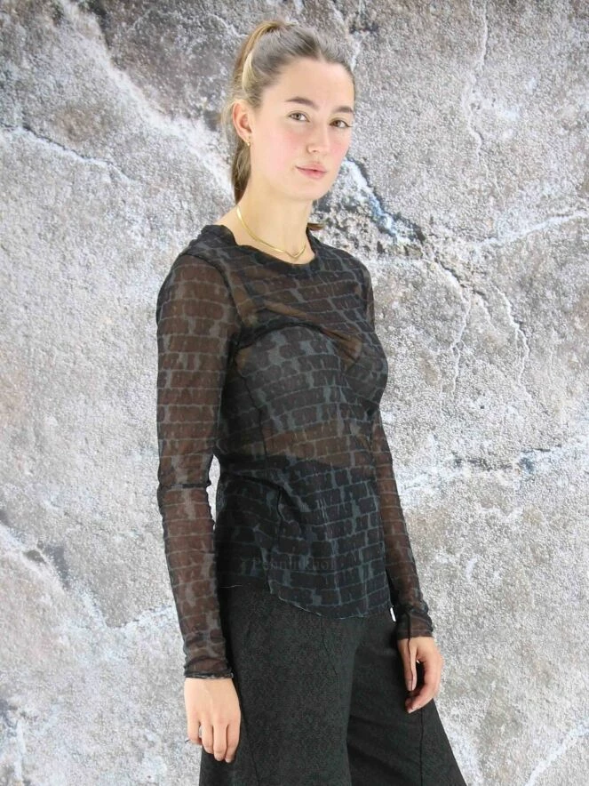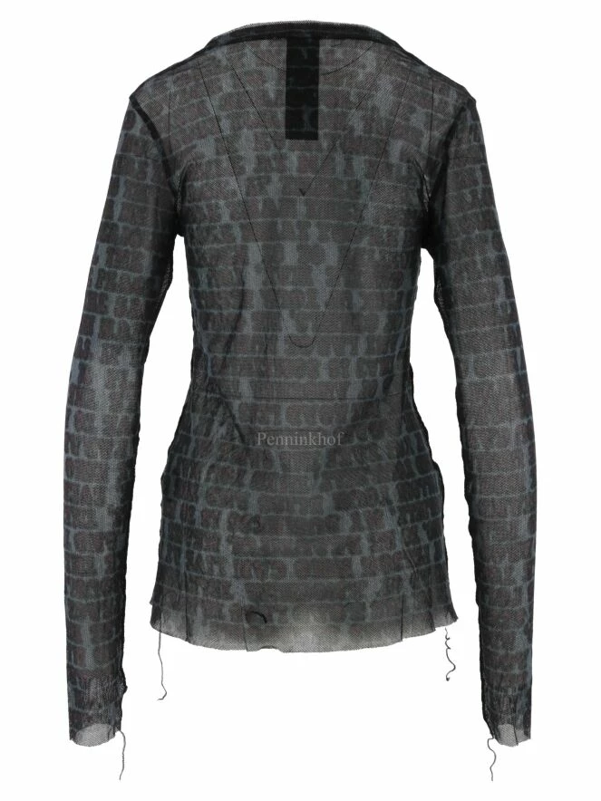 Chemise transparente de la marque Rundholz black label, à imprimé calligraphique aux couleurs bordeaux, noir et gris. La chemise présente un col rond et des manches longues. Des fils décoratifs descendent des manches et des côtés. Lavage à 30 degrés.