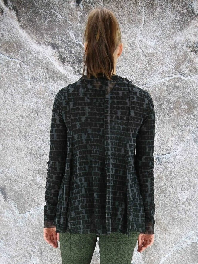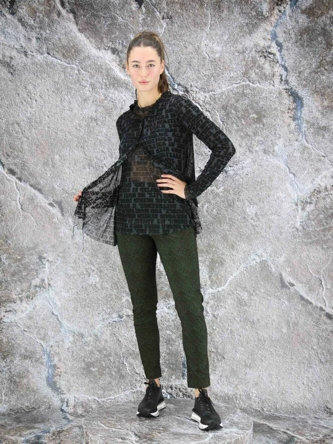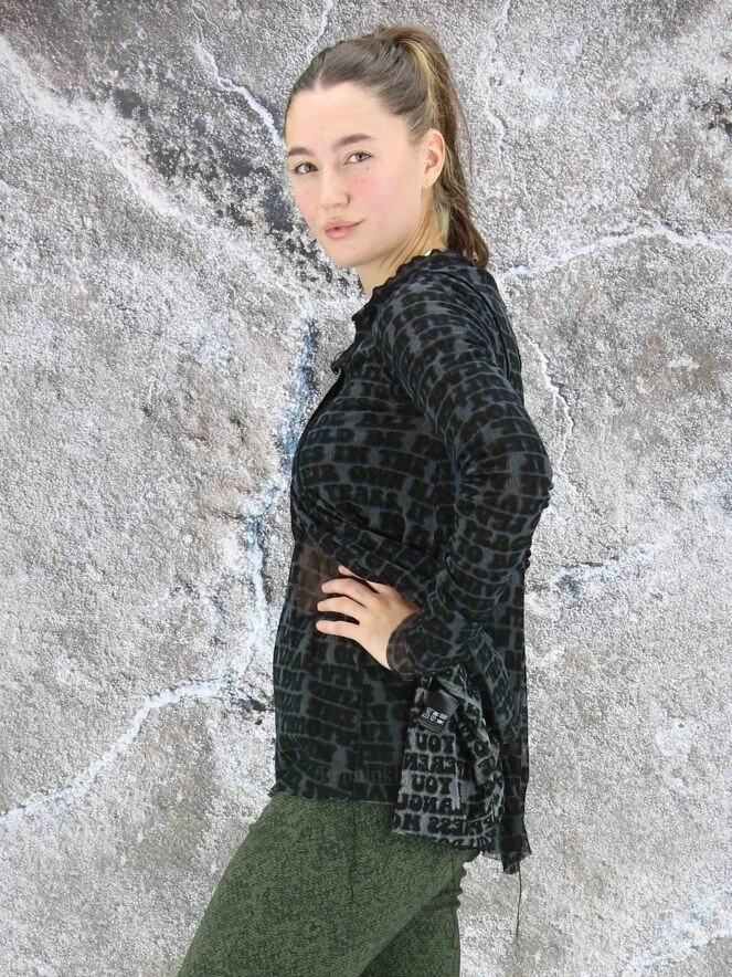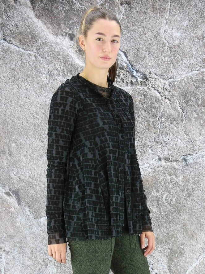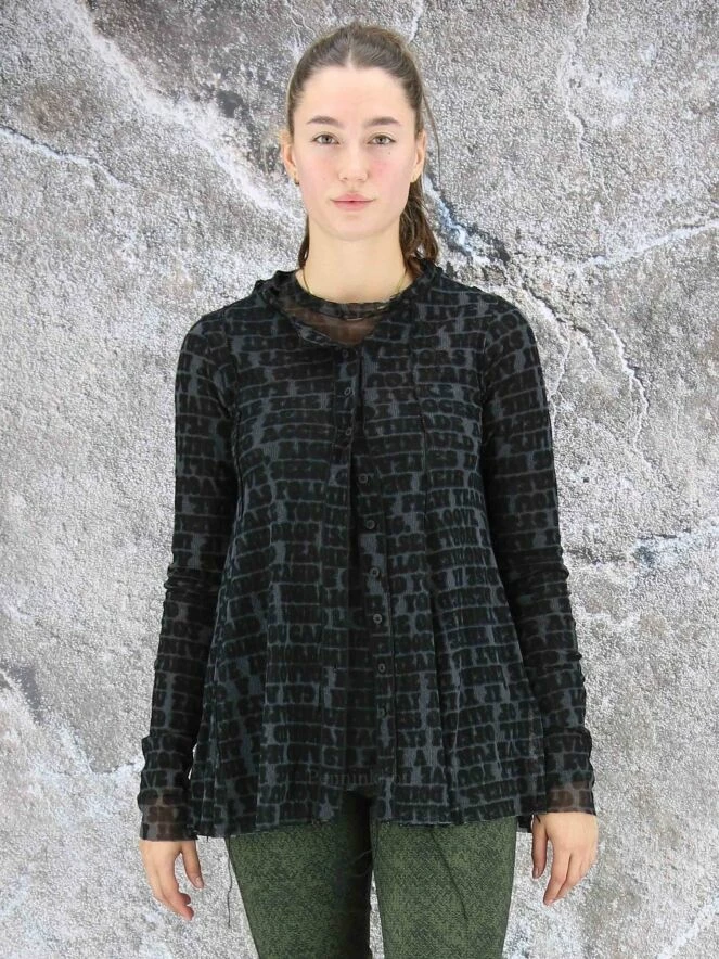 Chemise transparente à la coupe en ligne A de la marque Rundholz black label, à imprimé calligraphique aux couleurs bleu pétrole, noir et gris. La chemise présente un col légèrement montant orné d’un passepoil à double tissu et des manches longues. Des fils décoratifs descendent de la patte de boutonnage et des côtés. Lavage à 30 degrés.