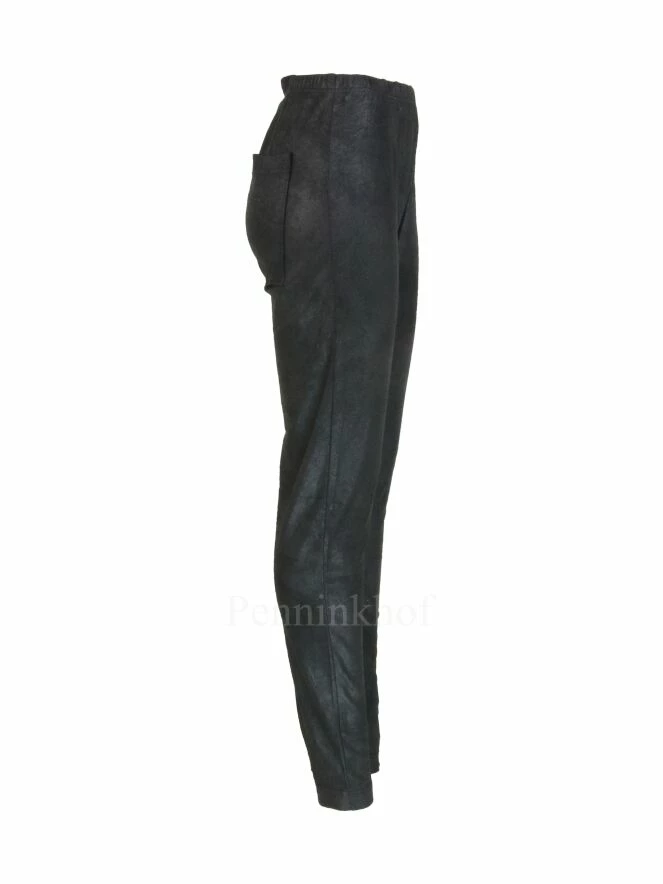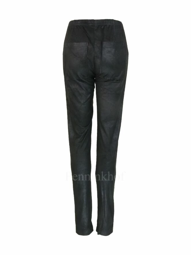 Pantalon traité dans un tissu ciré froissé très tendance de couleur noire, de la marque Rundholz. Il est équipé d’une bande élastique à fronces à la taille et de deux poches plaquées arrière. Lavage à 30 degrés.