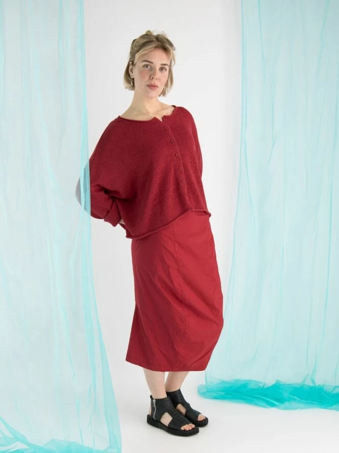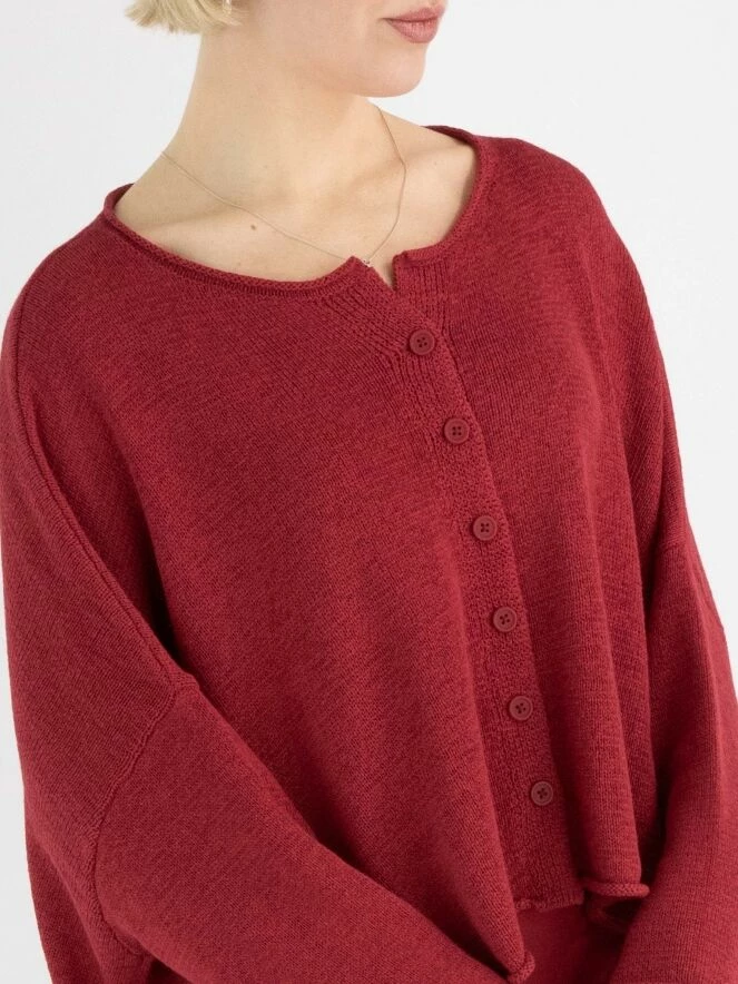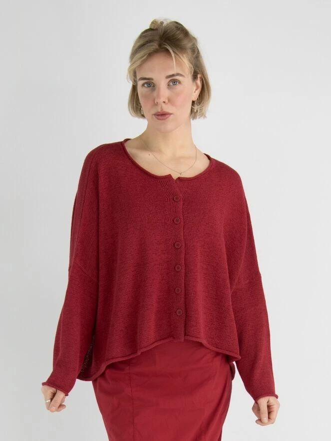 Un gilet léger, transparent et tissé ouvert de Rundholz Black Label en rouge. Le gilet est doté d’une fermeture avec 6 boutons et d’un col rond. Les manches courtes sont une extension des manches chauve-souris. Ce gilet peut être lavé à la main.