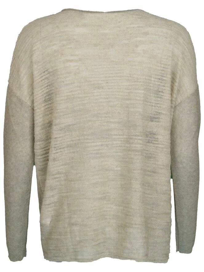 Gilet transparent de forme souple, de la marque Sarah Pacini, tricoté dans différentes mailles couleur sable. Sur les bandes latérales remontant sur les épaules, un fil argenté est ajouté, apportant une touche lumineuse. La fermeture se fait à l’aide d’une broche en forme d’épingle à nourrice recouverte du tissu. Modèle à col en V. Lavage à la main.