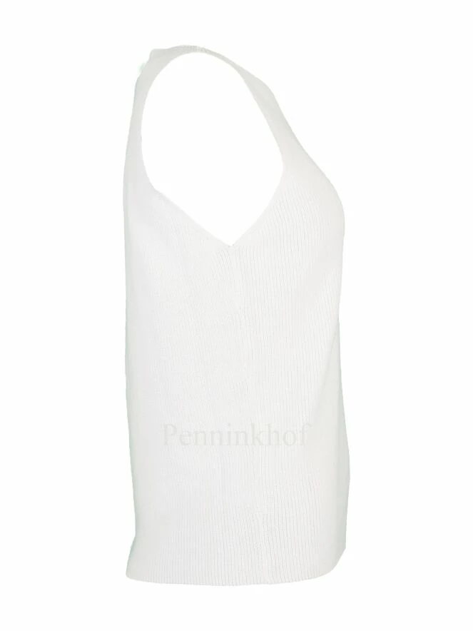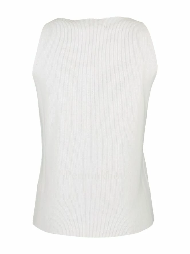 Top sans manches en tricot de couleur blanc crème, de la marque Tandem. Il présente un col rond et des emmanchures s’ouvrant depuis le milieu des épaules. Lavage à 30 degrés